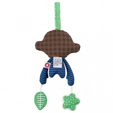 Aben har en blomst og et blad i hænderne, som giver en raslen og knitrende lyd, og som fanger babyens opmærksomhed. En sjov lille abe der fra starten kan være med til at udvikle babyens motoriske og visuelle færdigheder. Aben hænger i en strop med velcrolukning.