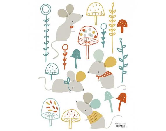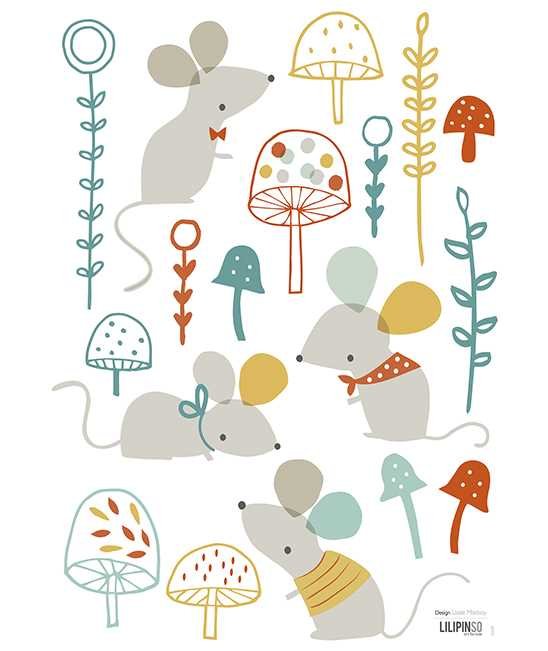 Mus og svampe wallstickers fra franske LilipinsoSuper søde mus og svampe i forskellige farver, mønstre og størrelser til at dekorere børneværelset med.