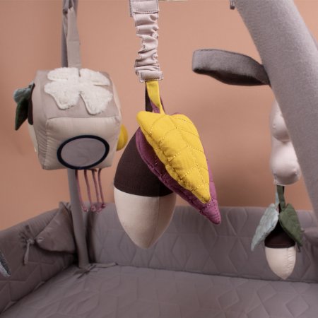 Skønt ophæng i økologisk tekstil til aktivitetstæppe eller BabygymUro der består af en dekorativ stor ahornnød og hjerteblade.