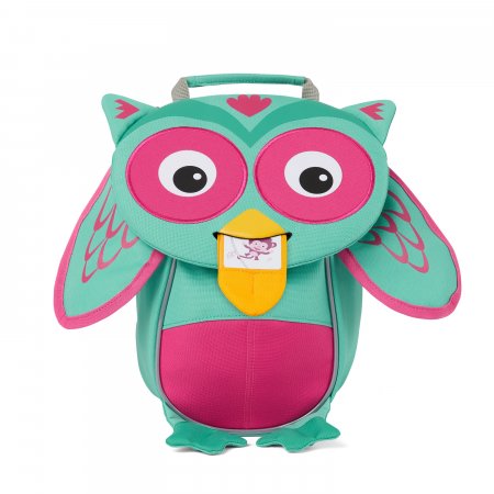 Smart, sjov og funktionel ugle rygsæk i tyrkis og pink design.Rygsækken lukkes med lynlås og har et stort rum og en indvendig elastik lomme. Uglens tunge sidder fast med elastik, og når man trækker i den, kommer et fint navneskilt frem.
