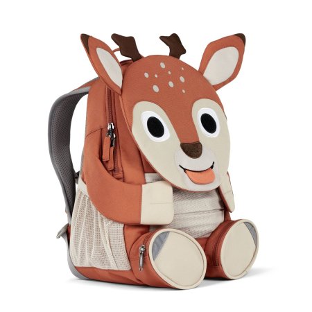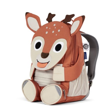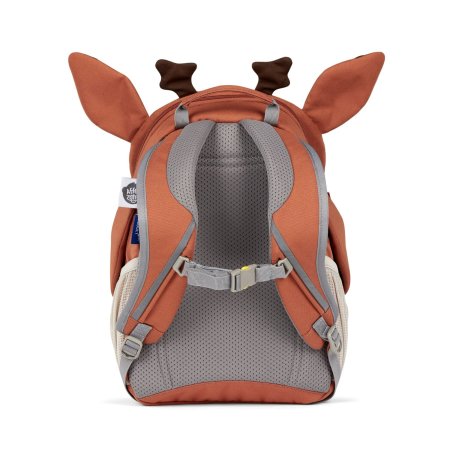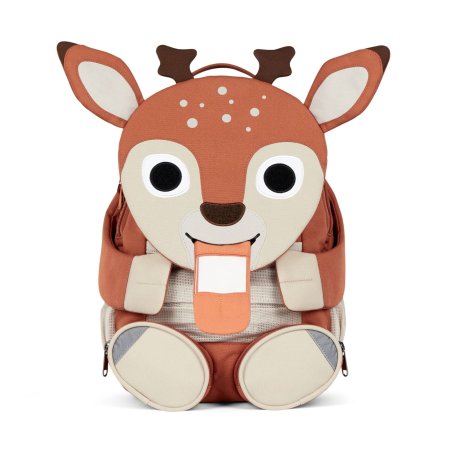 Hjorten har velcro ved ben, som kan sættes fast forskellige steder på rygsækkens forside. Dens tunge sidder fast med elastik, og når man trækker i den, kommer et fint navneskilt frem, hvor barnets navn kan stå.