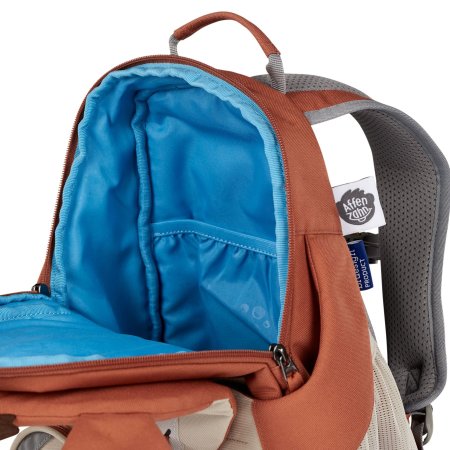 Siden, der vender ind mod barnets ryg, er lavet i et åndbart materiale og taskens skulderstropper er justerbare og polstret, hvilket gør tasken behagelig at bære.