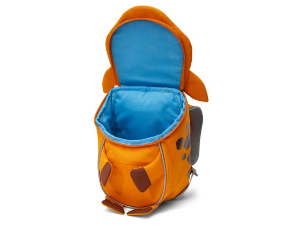 Rygsækken lukkes med lynlås, og har et stort rum og en indvendig elastik lomme. Dyrets tunge sidder fast med elastik, og når man trækker i den, kommer et fint navneskilt frem.