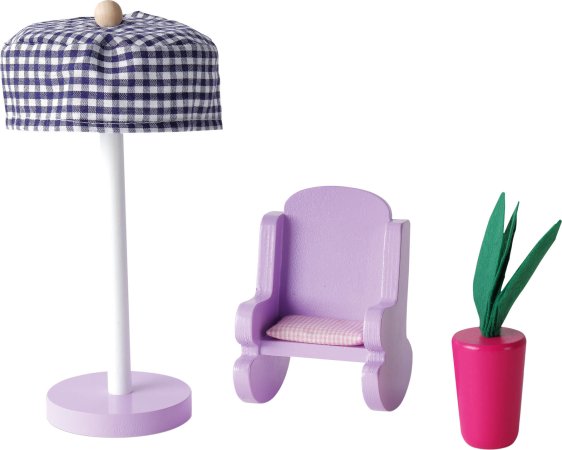 Stilfuld dukkehus i tre etager med masser af plads til de farverige møbler, der følger med.