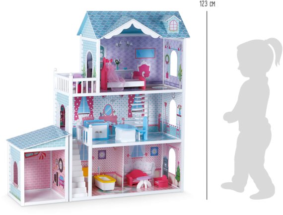 Huset har en størrelse, så flere børn uden problemer kan lege med huset samtidigt. De fine detaljer på vægge, trapper, garage og balkon gør dukkehuset til et luksushjem, fyldt med muligheder for kreativitet.