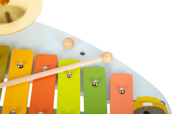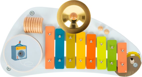 Musikbordet er udstyret med bækken, xylofon, skralde og aftagelig tromme til at give børn en række forskellige lydoplevelser med.