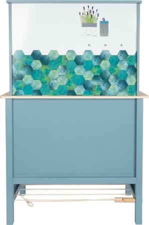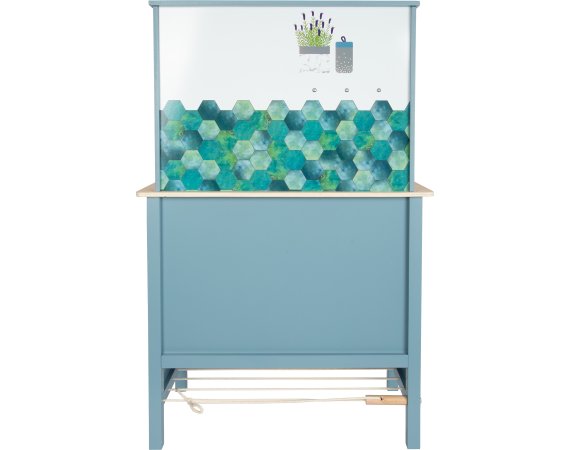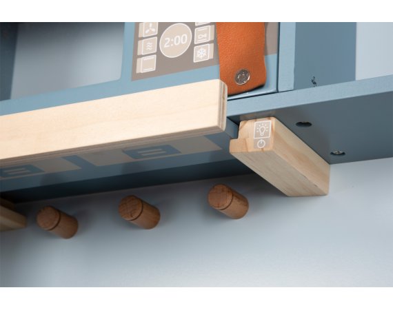 Legekøkkenets bagvæg er vendbar og har højkvalitetsprint fliselook. Der er snorehylde nederst og fine knage på køkkenets side til ophængning af viskestykker eller kridttavle mm.