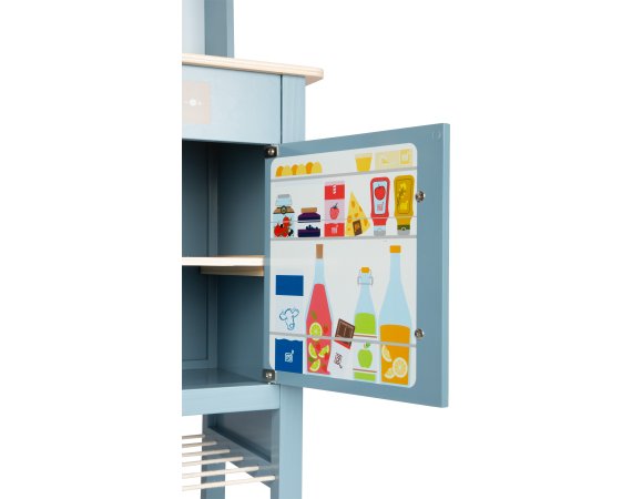Når der skal vaskes op, gøres det i køkkenets runde metal håndvask, hvor armaturet har rød og blå farve, så man ikke er i tvivl om, det er den kolde eller varme vandhane, man åbner. Køleskabet er udstyret med printede overflader i form af knapper, mad og flasker for inspiration og sjov legeeffekt.