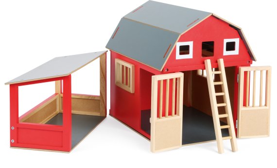 Den store røde træ lade og hestestald er lavet ud fra en midt vest amerikansk stald med højt til loftet, så den kan rumme heste. Laden har desuden en rummelig veranda og et høloft, der kan nås via den fine stige i træ.