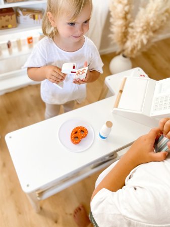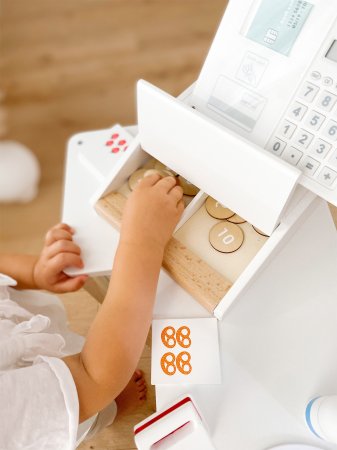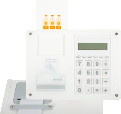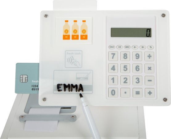 Det er vildt, fordi tallene der slås ind i kasseapparatet vises, kasseapparatets møntboks kan åbnes fra oven og er opdelt i to. Der medfølger fem fine madkort trykt på begge sider, der både opmuntrer til at lære at tælle og regne. Hvis du foretrækker at skrive frem for at regne, kan du nemt indtaste priserne for købte varer på akrylglasoverfladen foran på kasseapparatet. Der medfølger nemlig en slet bar pen med integreret svamp til signering på akrylglasoverfladen. Og det medfølgende kreditkort kan selvfølgelig stikkes ind i siden på kasseapparatet og scanningsflade kan nemt klæbes på en eksisterende butik eller en anden legeflade.