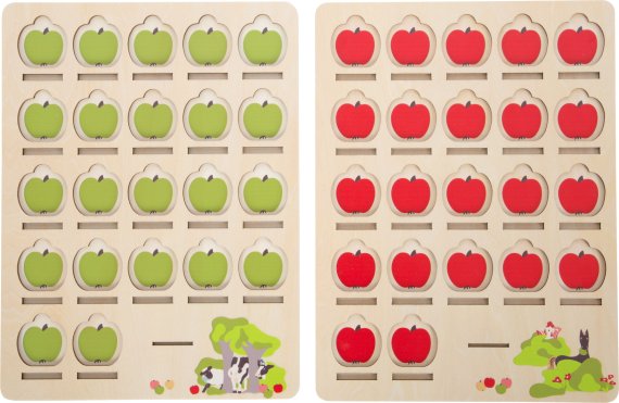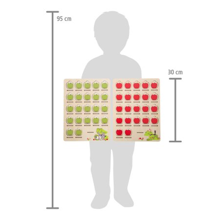 Dimensioner: spilleplade ca. 30 x 23 x 1 cm; æble ca. 3,5 x 3 x 0,5 cm