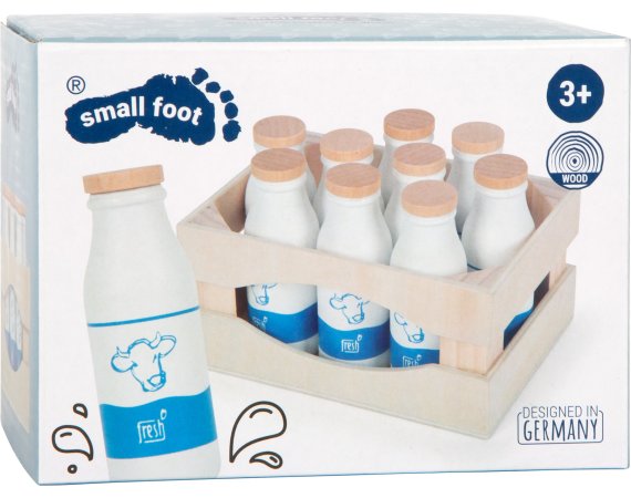Trækasse med ti mælkeflasker i træ til den lille købmandsbutik, eller til at servere lækker morgenmad i legekøkkenet. Flaskerne er malet hvide og har fine enkle illustrationer med en ko, så selv mindre børn kan se, hvad de indeholder!