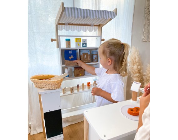 I fantasifuldt rollespil kan børn først købe trænudlerne i butikken og derefter lave dem til en lækker pastamenu i børnekøkkenet sammen med anden legemad fra small foots Fresh produktlinje.