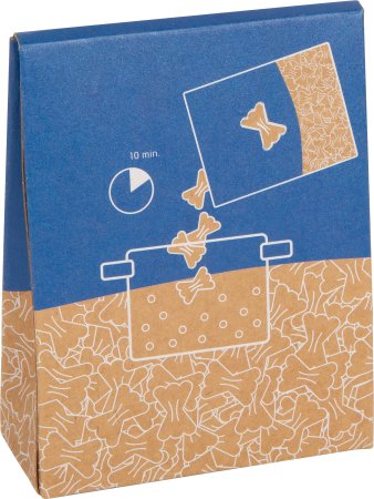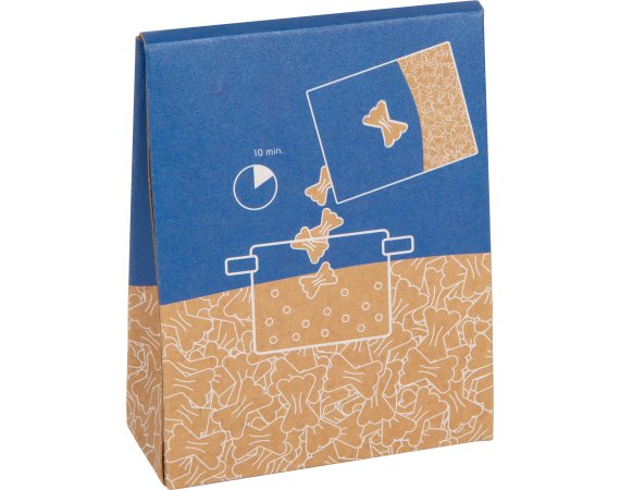 Med deres naturlige look og den miljøvenlige foldeæske i pap, vil pastasløjferne uden tvivl blive et hit. På bagsiden af pastapakken er der madlavningsvejledning på billeder, som selv små børn kan forstå.