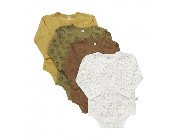 Pakke med 4 bodyer i gul, grøn, brun og hvid fra Pippi.