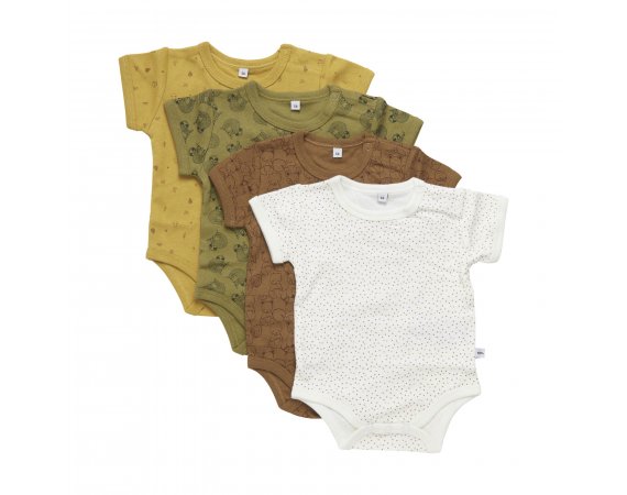 Pakke med 4 bodyer i gul, grøn, brun og hvid fra Pippi.