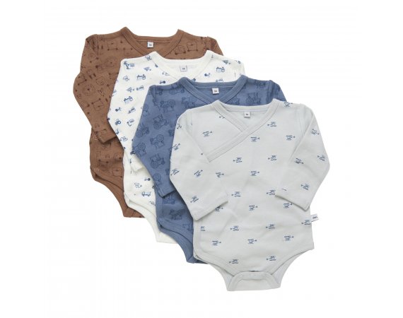 Pakke med fire fine slå-om bodyer i blå, brun og hvid fra Pippi.