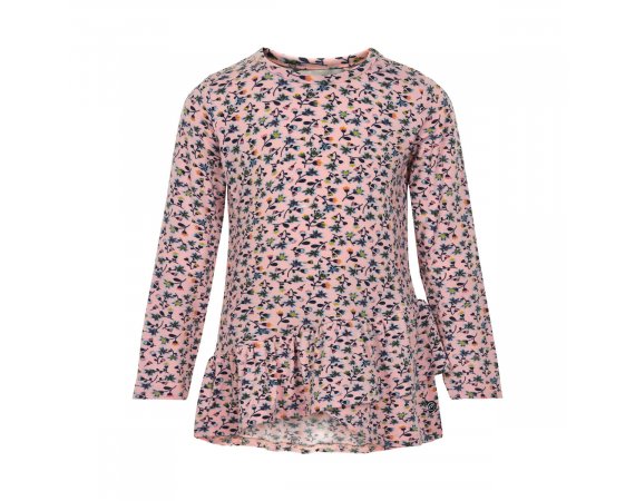 Flot langærmet lyserød tunika med all-over blomsterprintBlusen har flæsekant forneden, som går længere ned bagpå.