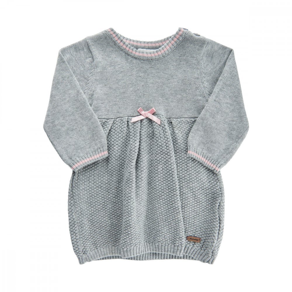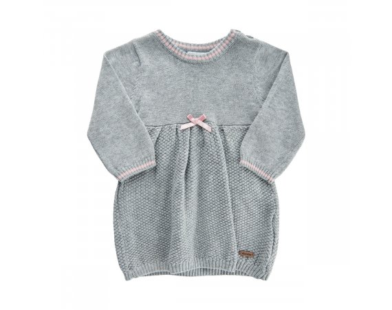 Yndig og blød kjole med sød sløjfe i strikKjolen er sammensat af forskellig strikmønstre og har søde rosa striber i rib ved ærmer og i hals.
