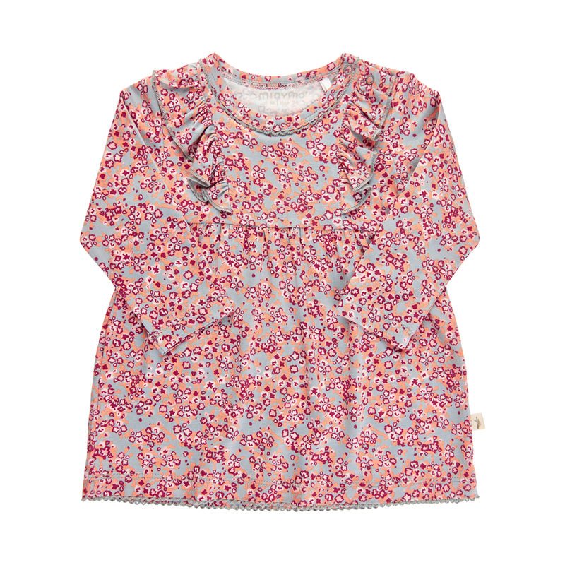 Sød langærmet kjole med blomster og broderi i halsudskæring, ved flæser og forneden.Kjolen har et rynket skørt og fine flæsedetaljer på brystet. Den er lavet i en lækker bambus viskose og lukkes med trykknapper på venstre skulder.
