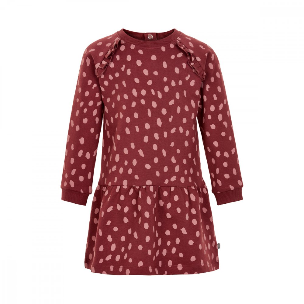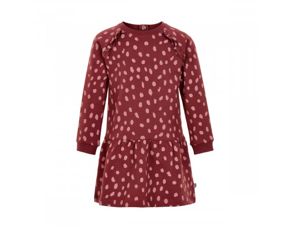 Sød kjole i sweat med lange ærmer og flot prik mønster.Kjolen har raglanærmer med flotte flæser og rynk i skørt, som giver et et flot fald.