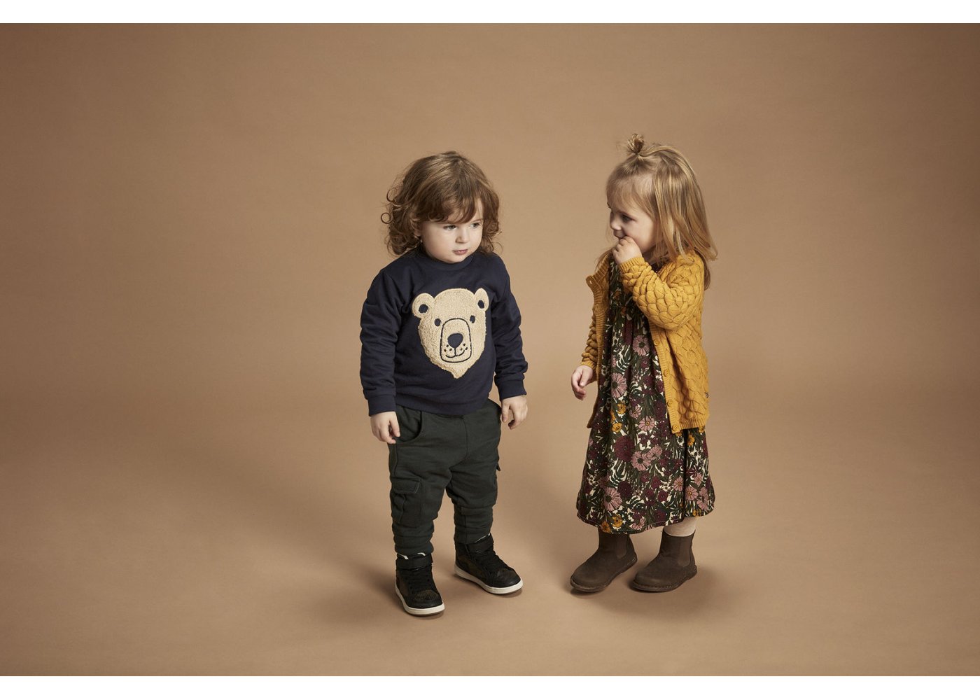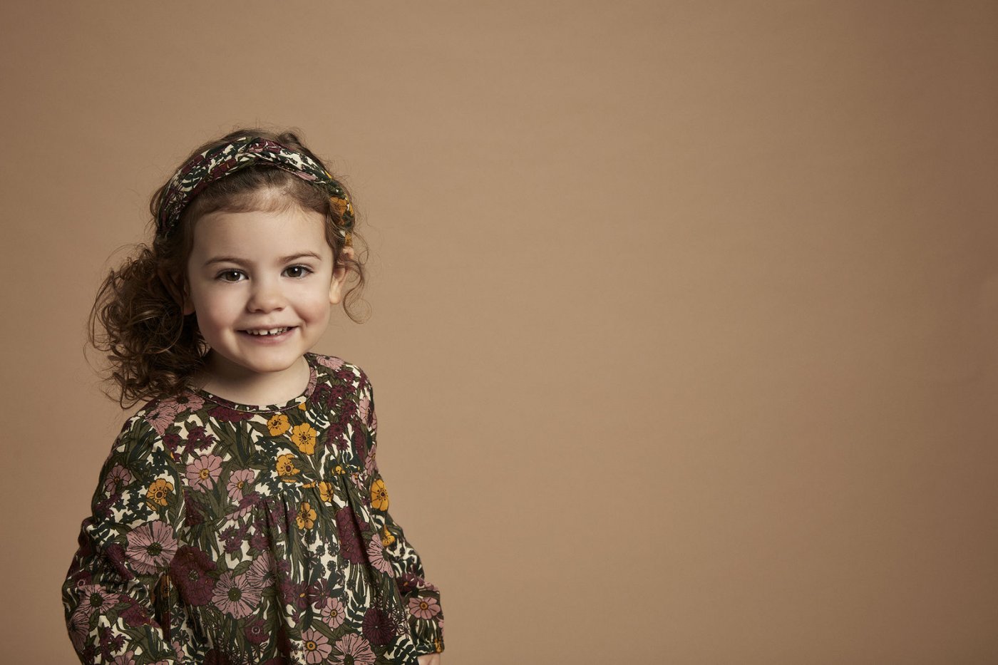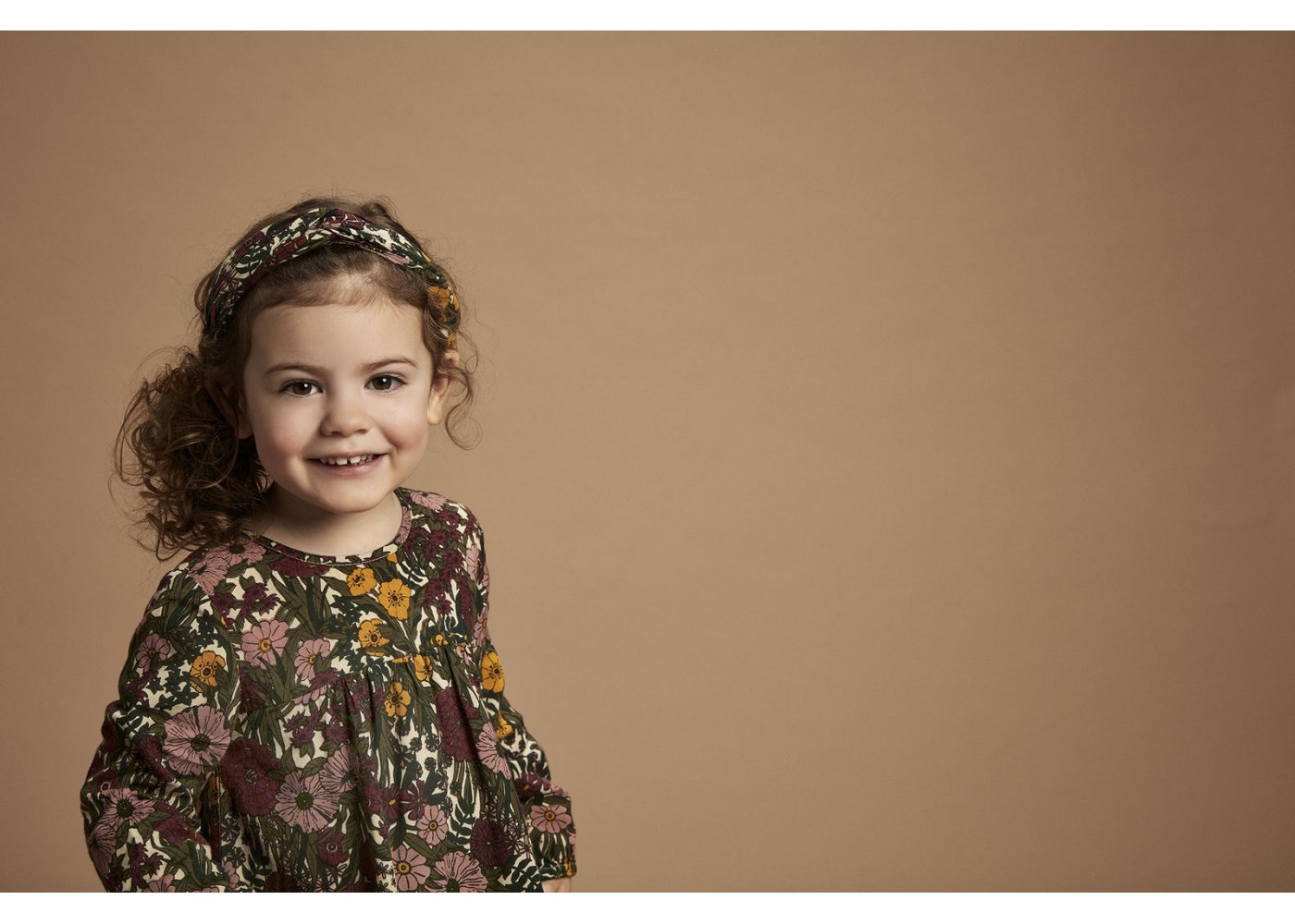 Skøn kjole med blomster og lange ærmer med elastik ved håndled.