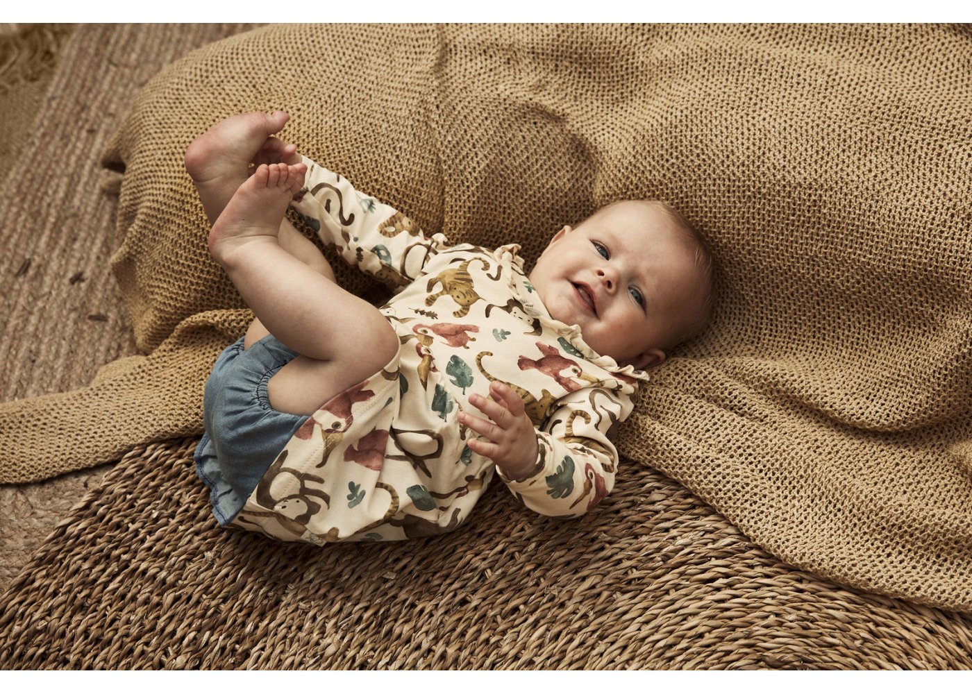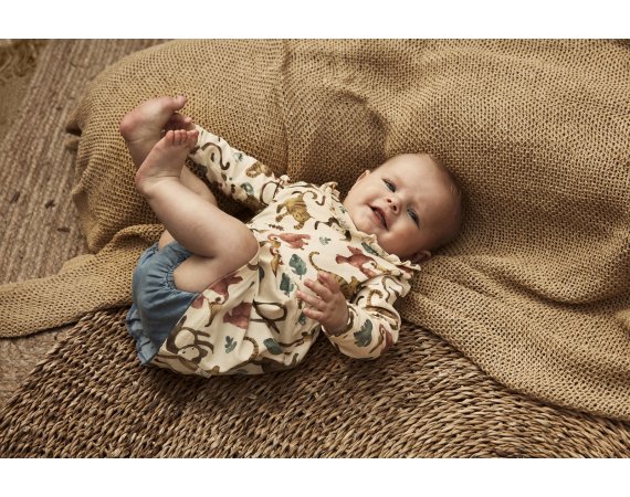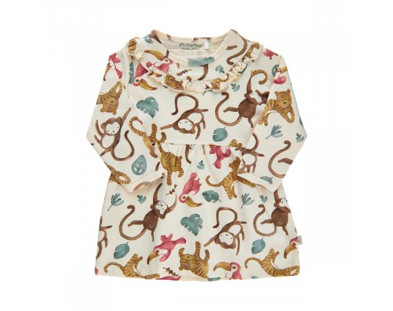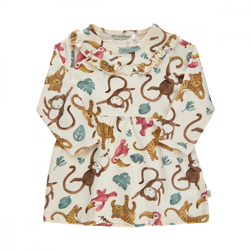 Sød kjole med sjove dyr.Kjolen har en sød flæse under halsudskæring, et fint rynket skørt og lukkes med trykknapper på venstre skulder.