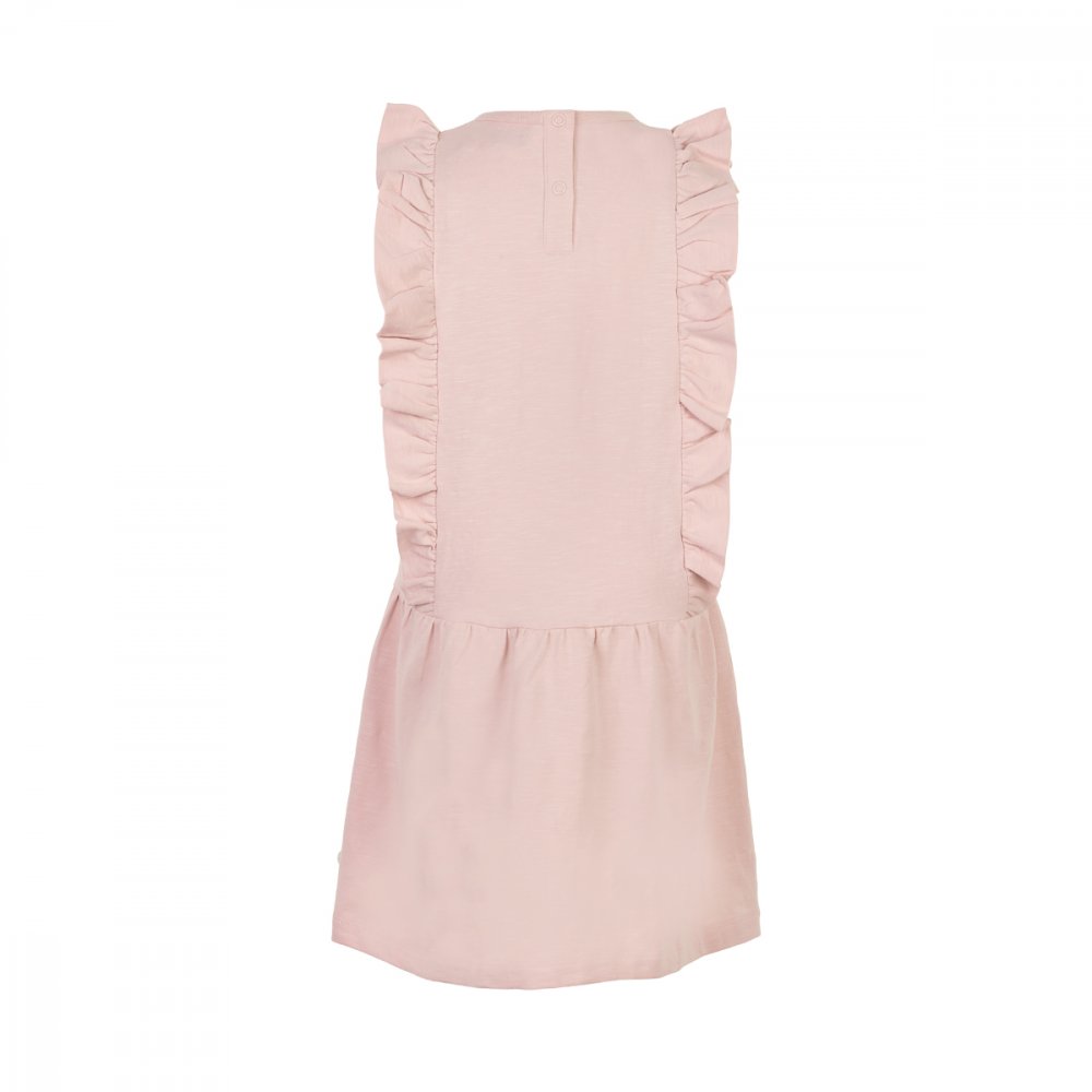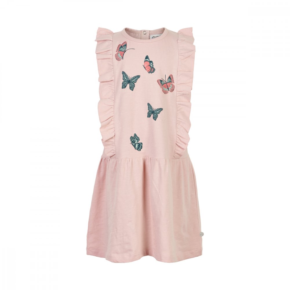 Dejlig rosa kjole med sommerfugle print foran i sort, blå og rosa nuancer fra Minymo.Kjolen har rund halsudskæring, yndige flæseærmer og lukkes med trykknapper i nakken. Kjolen har et fint skørt med rynker.