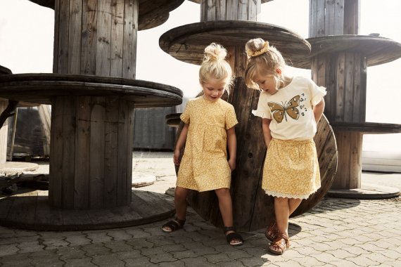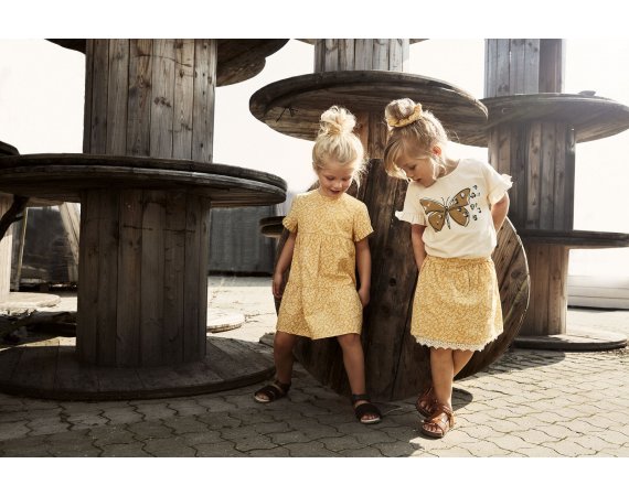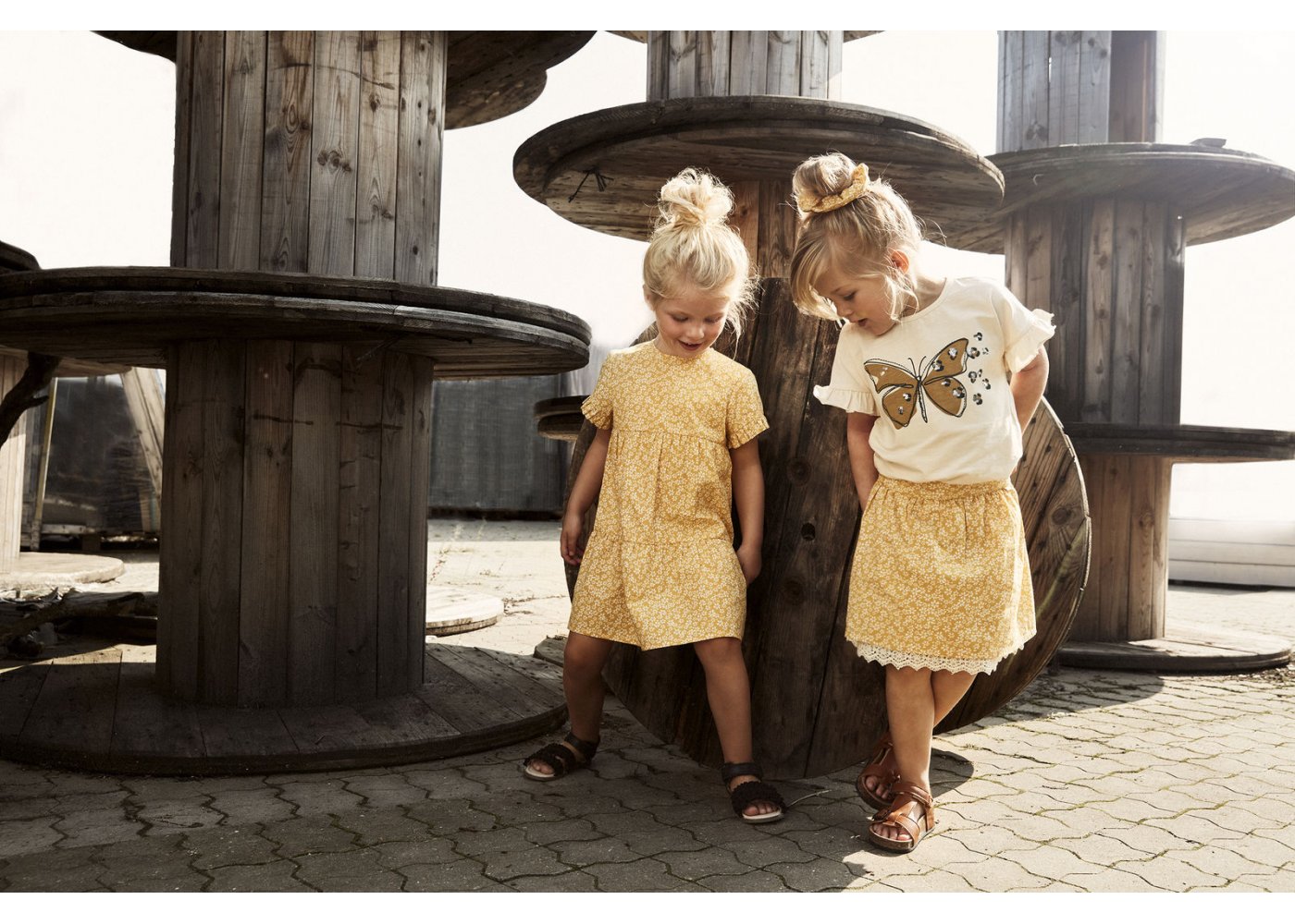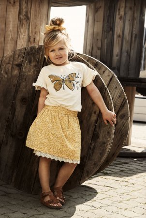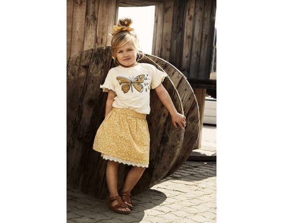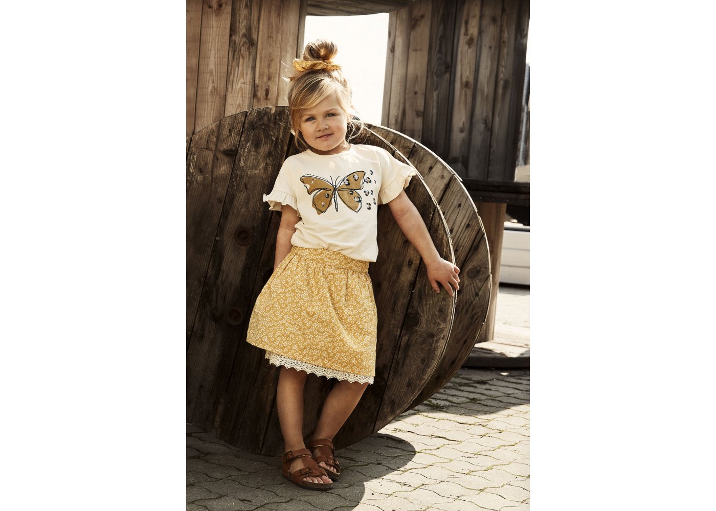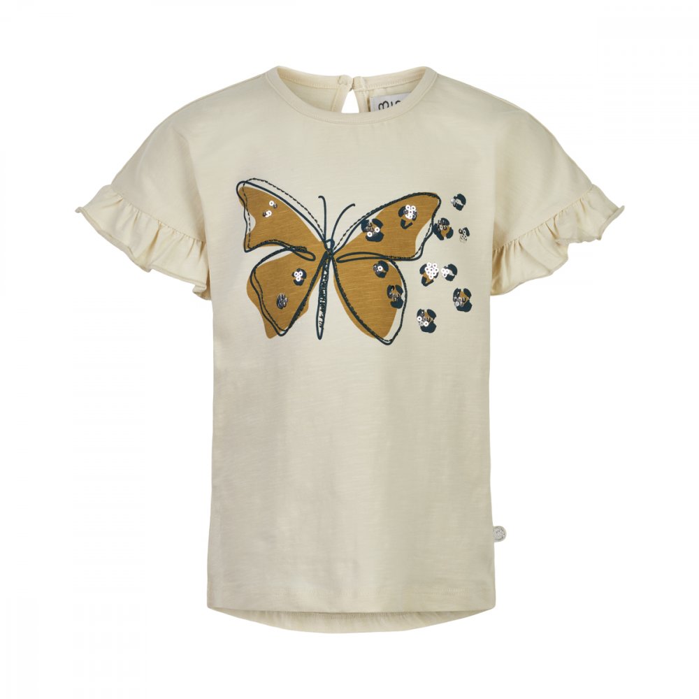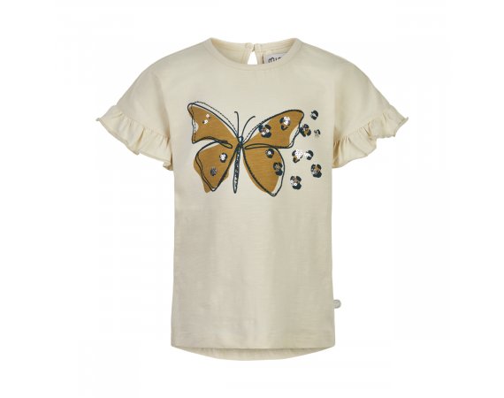 Yndig hvid/cremefarvet t-shirt med sommerfugl og fine palietter foran fra Minymo.Blusen har søde feminine flæseærmer og lukkes bagpå med en knap. T-shirten er fremstillet i en blød, behagelig bomuld og passer perfekt sammen med Minymo nederdel med schrunchie, white swan.