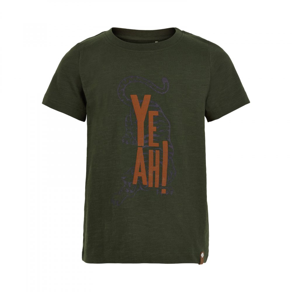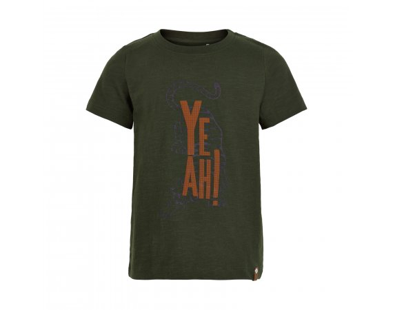 T-shirten har ribkant i halsåbning og et sejt tigerprint og tekst på forsiden.