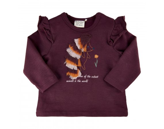 Skøn langærmet sweatshirt med flæser på skuldre og sødt pindsvin med garnpigge i flotte farver på brystet. T-shirten er fremstillet i en lækker økologisk bomuld.