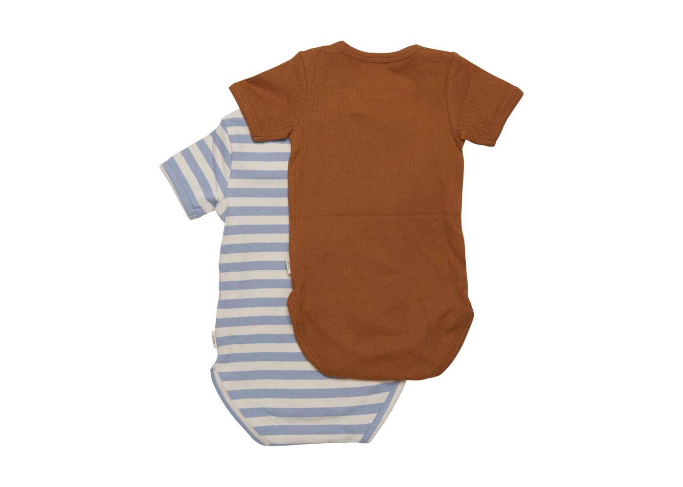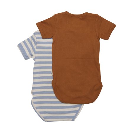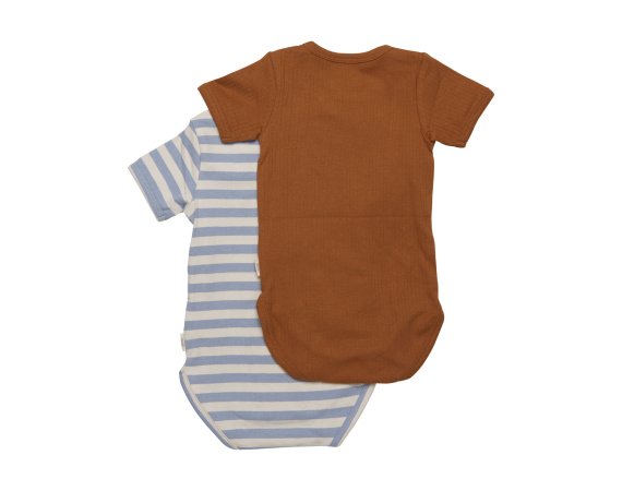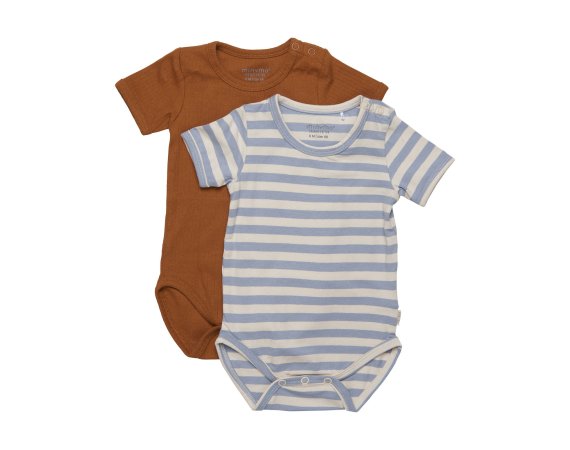 Kortærmede bodyer fra Minymo, brun og blå.