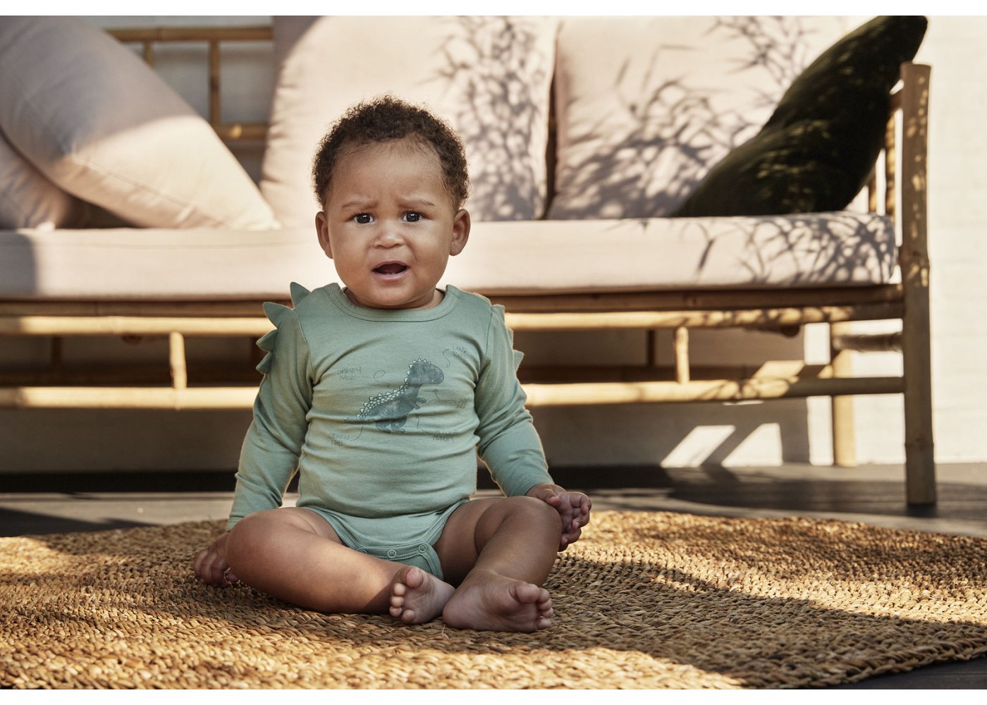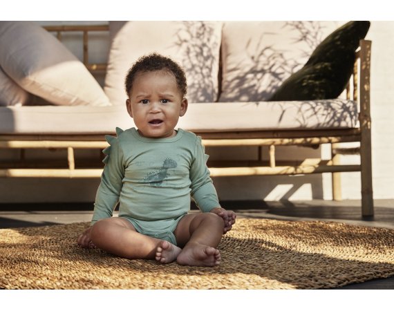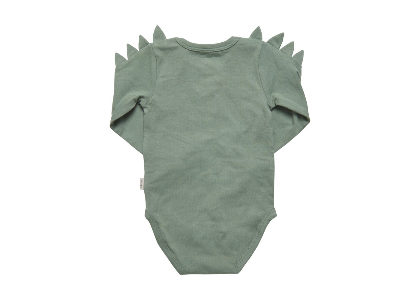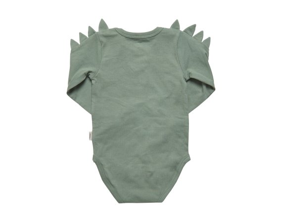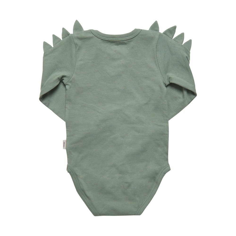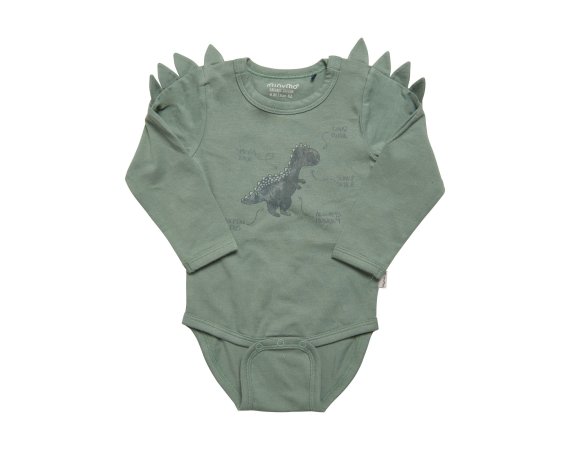 Sjov body med rund halsudskæring og dinosaur takker på skuldre.