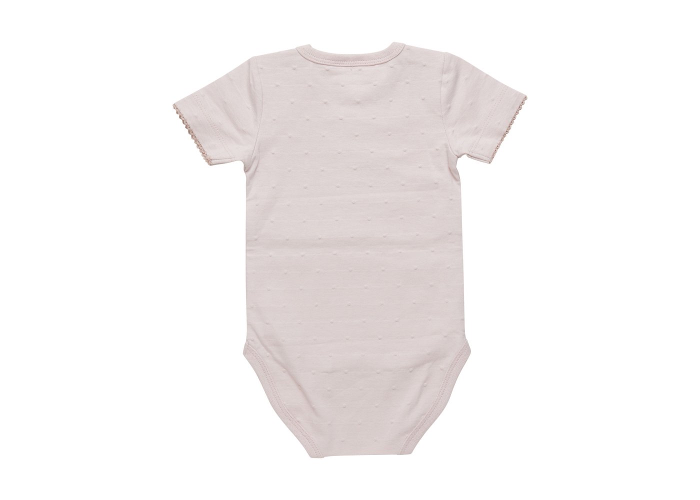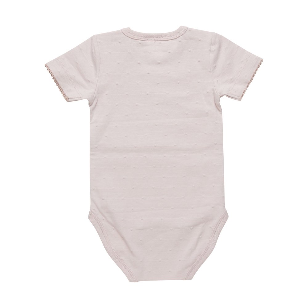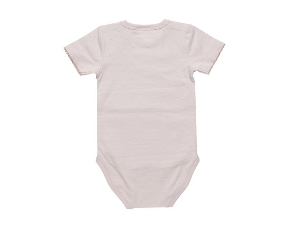Bodyen har en sød blondeafslutning ved ærmer, ribkanter i alle åbninger og lukkes med trykknapper på skulder og mellem ben.