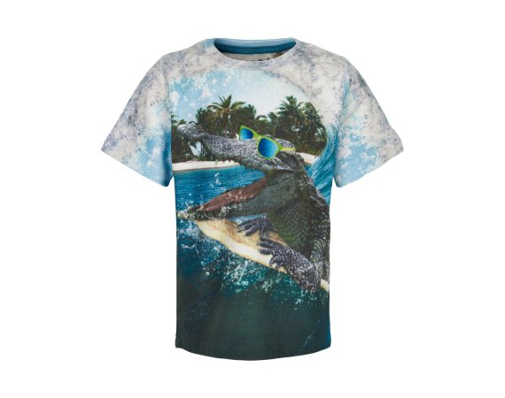 Flot flerfarvet t-shirt med krokodille motiv foran.