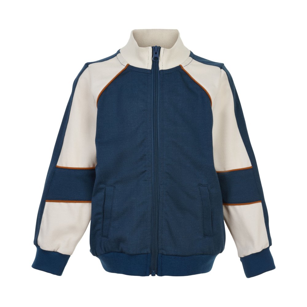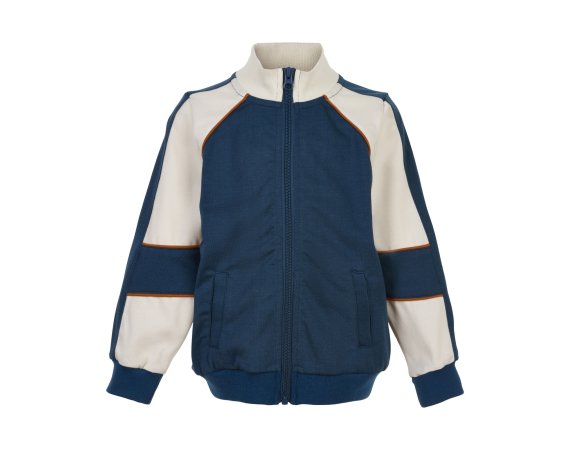 Smart blå cardigan med kontrastfarvede striber og pipings fra Minymo.