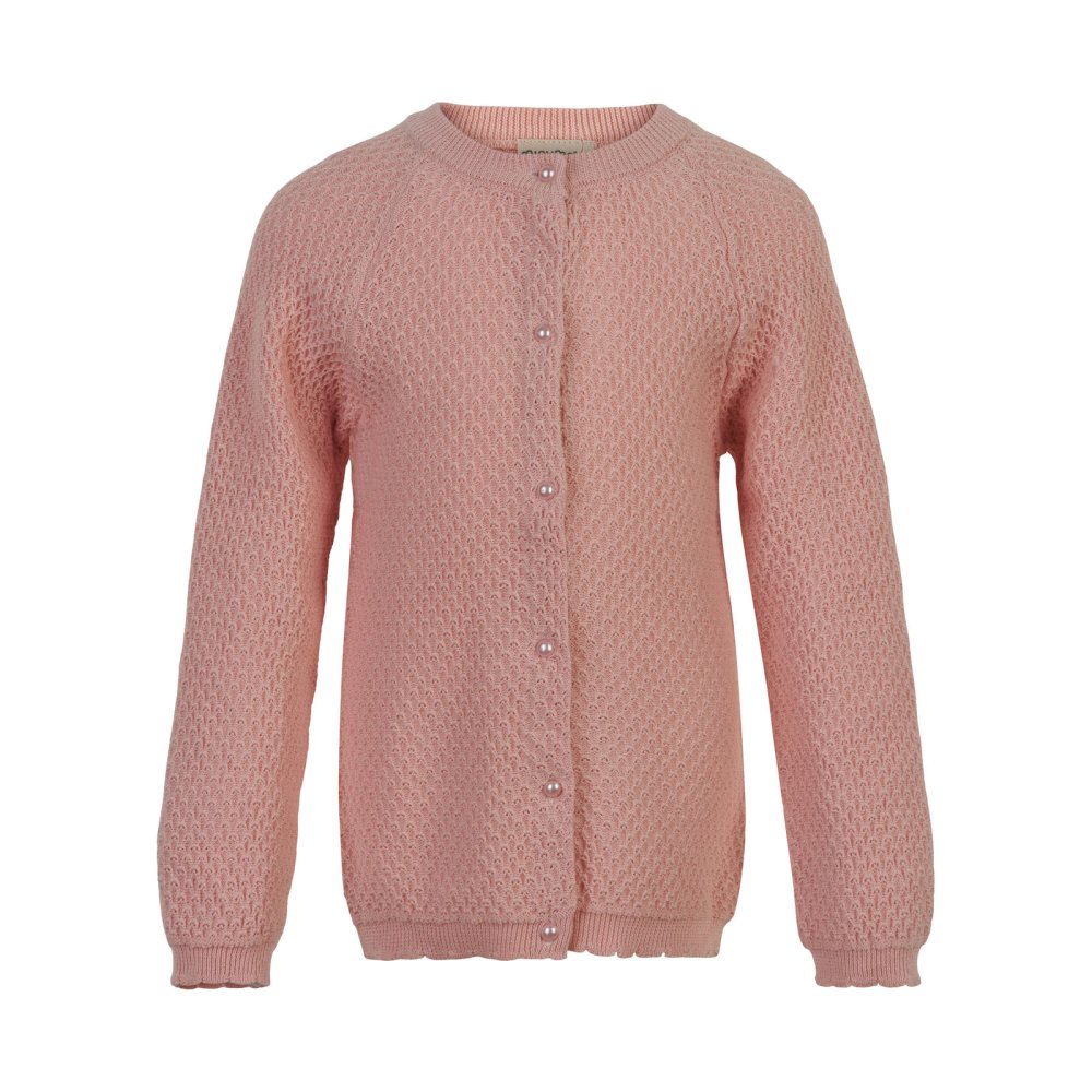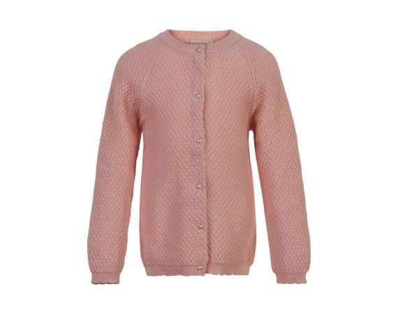 Skøn strikket cardigan med flot mønster fra Minymo.Trøjen har ribstrik i alle åbninger og lukkes med flotte perlemor knapper foran.