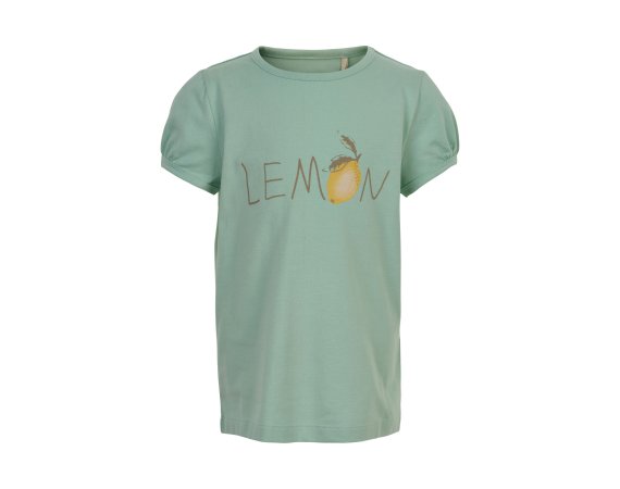 Flot grøn t-shirt med lemon motiv foran.T-shirten har korte puf ærmer, en rund halsudskæring og er fremstillet i en lækker bomuldsjersey.