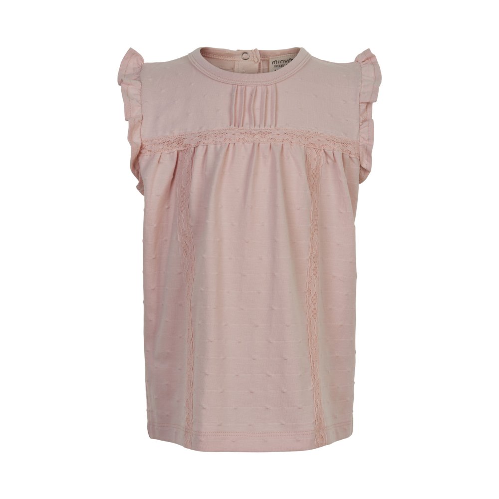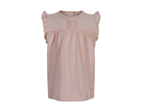 Toppen har små flæseærmer, en rund halsudskæring og flæser i brysthøjde.
