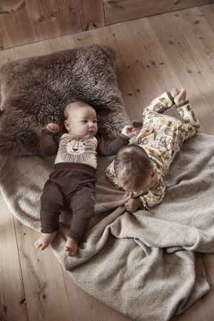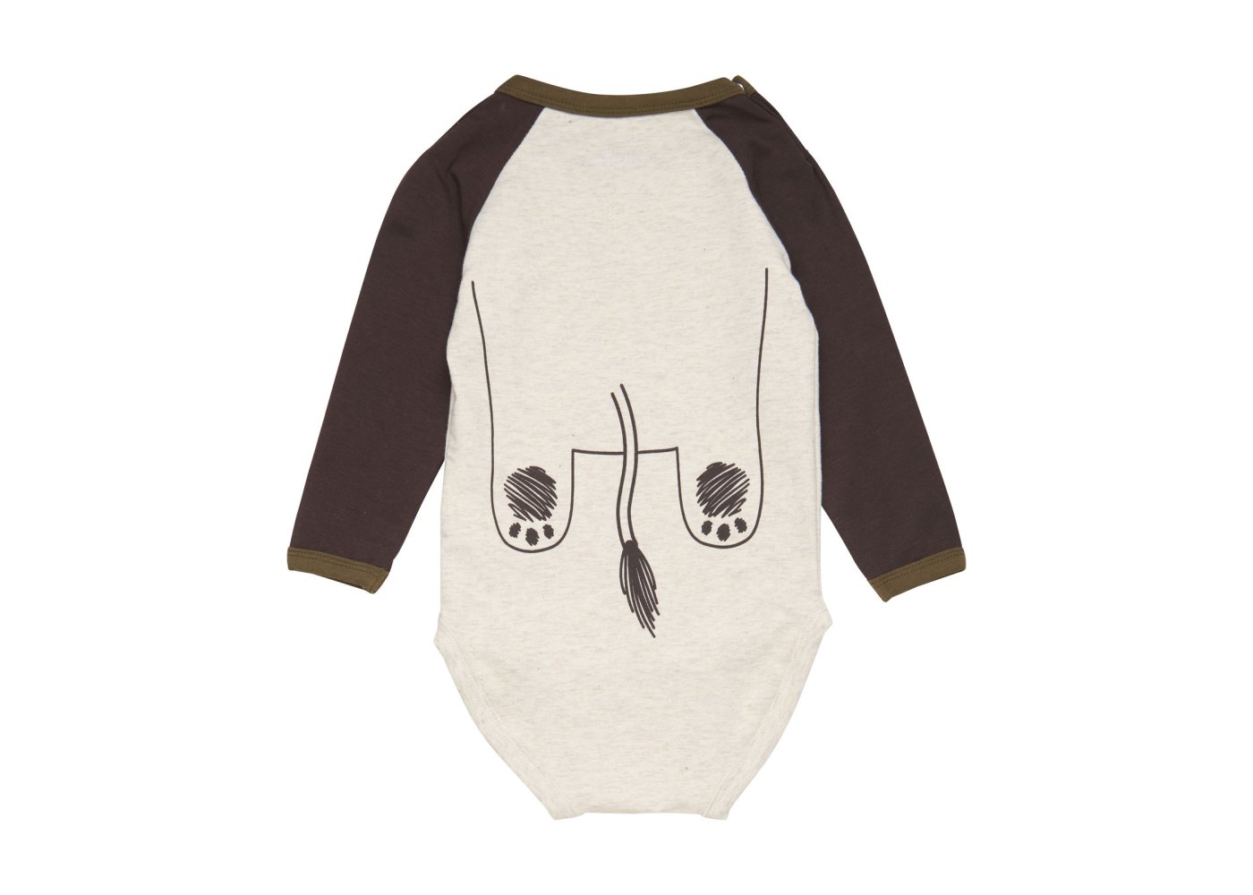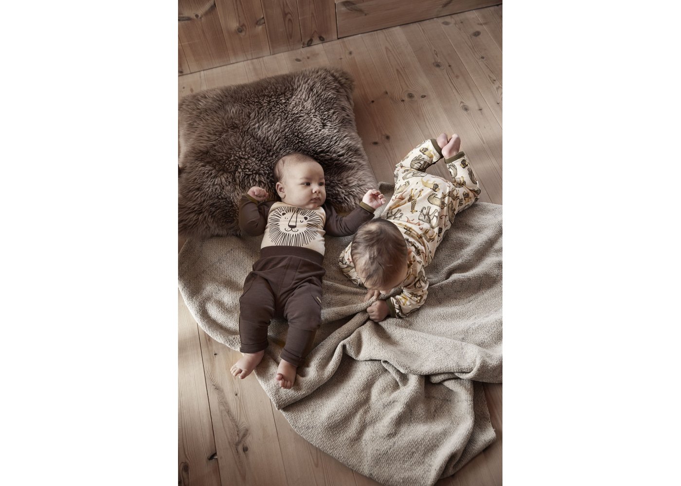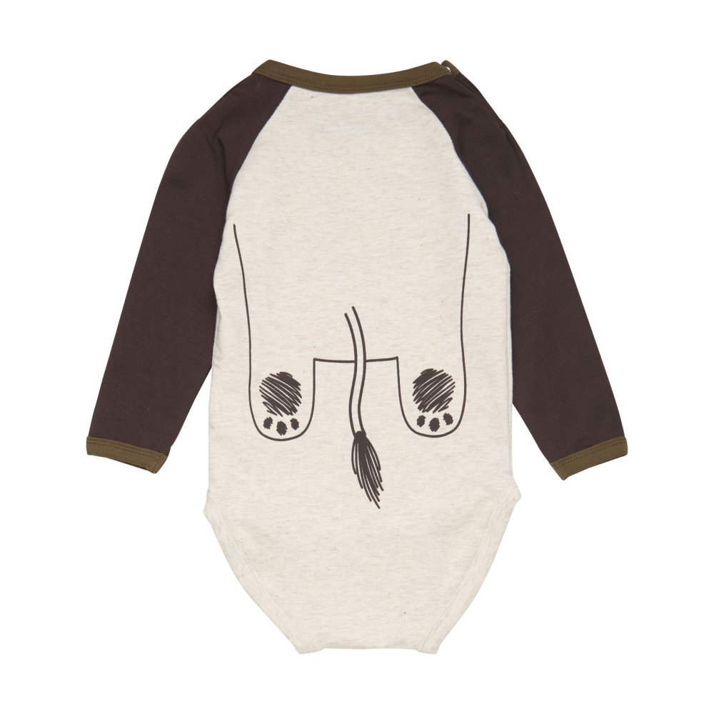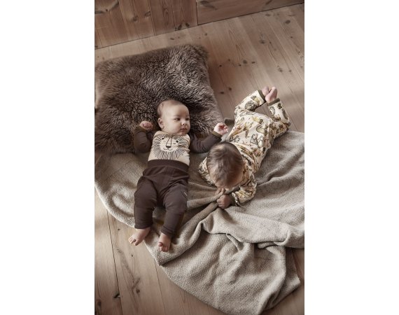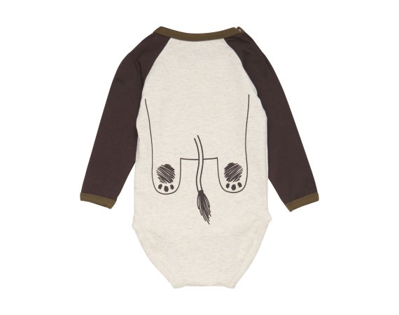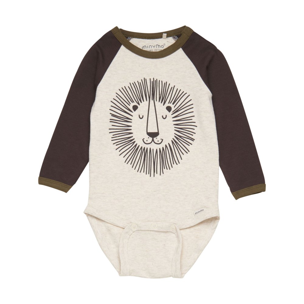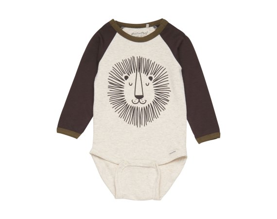Body i brune nuancer med sødt løvehoved foran og hale og poter bagpå. Bodyen har lange ærmer og lukkes med trykknapper på skuldre og mellem ben.