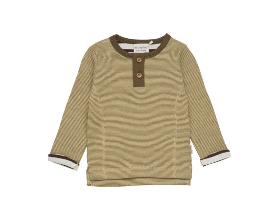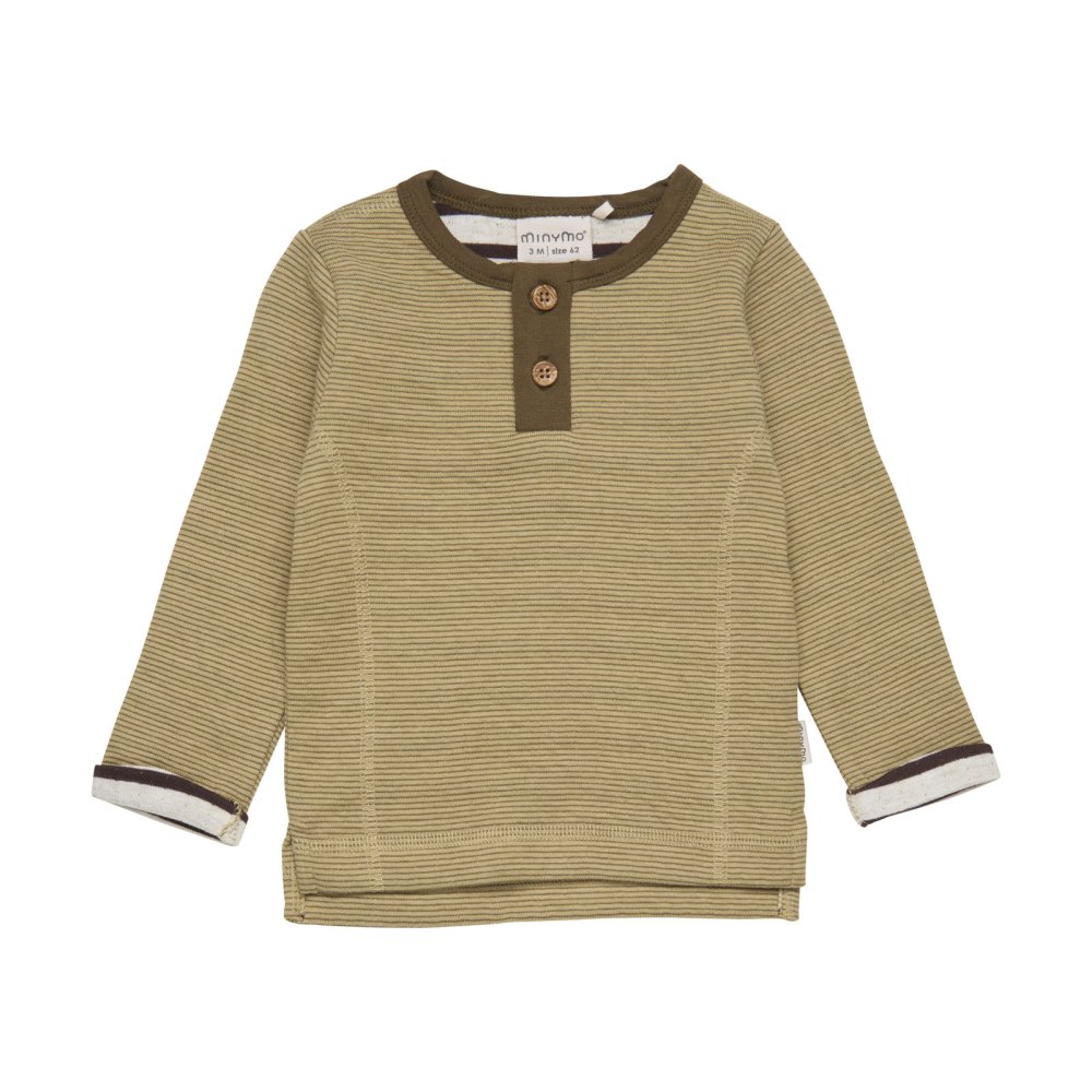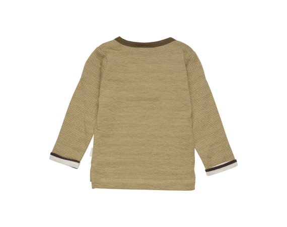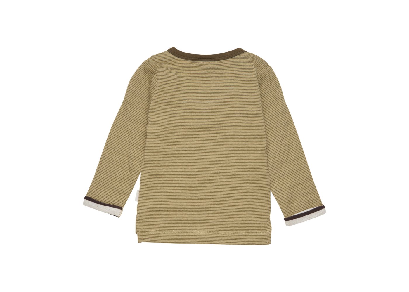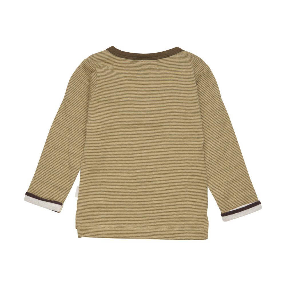 Smart dobbeltsidet grønstribet t-shirt med ombuk ved håndled og brun stolpelukning med knapper foran på brystet. Der fås bukser i samme flotte design.