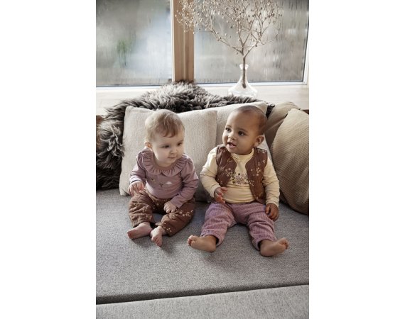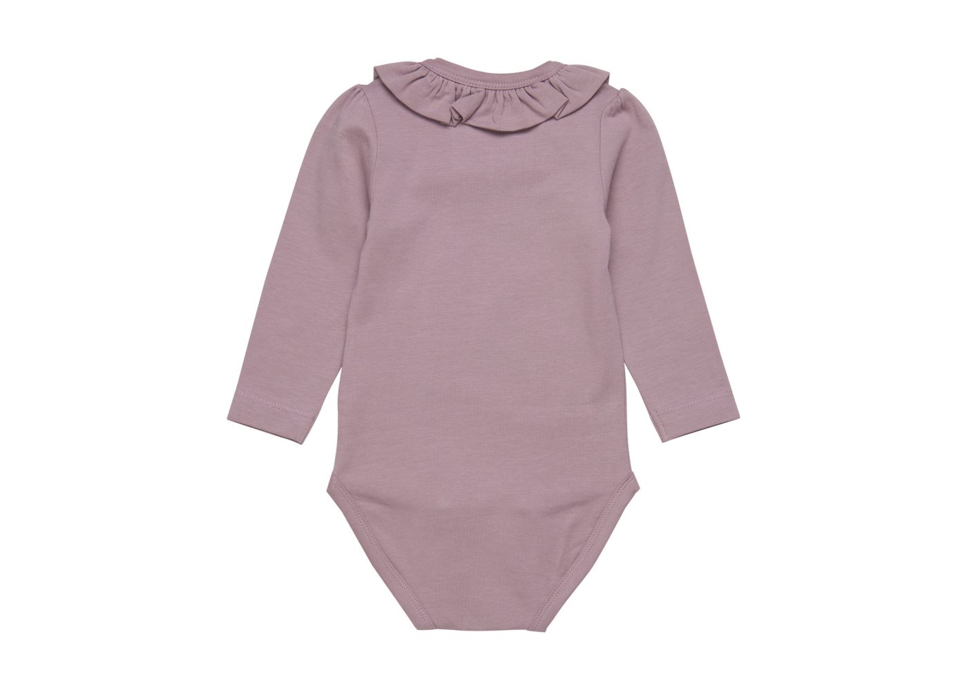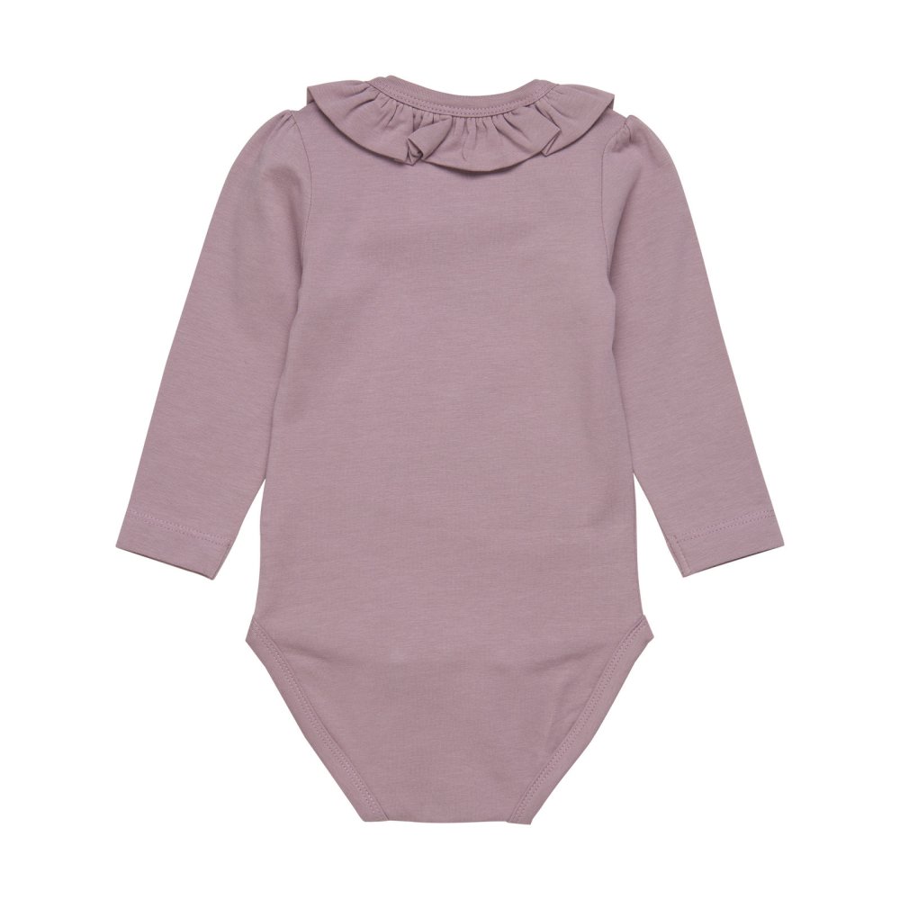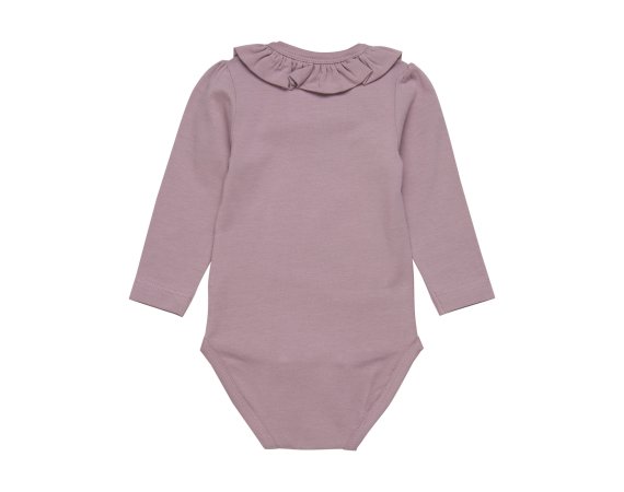 Bodyen har lange ærmer og en flot flæse i halsudskæring.Bodyen lukkes med trykknapper på skulder og mellem ben.