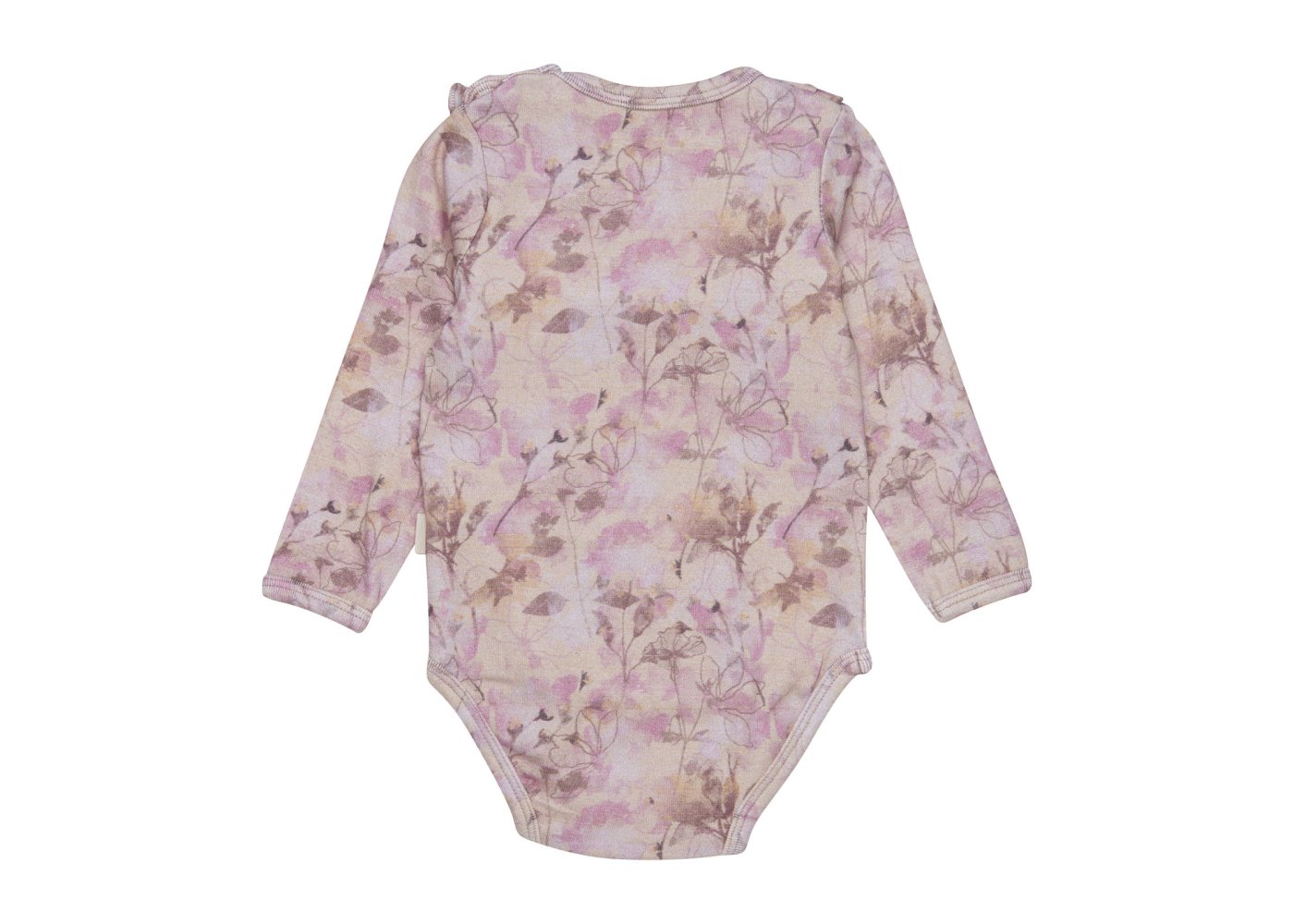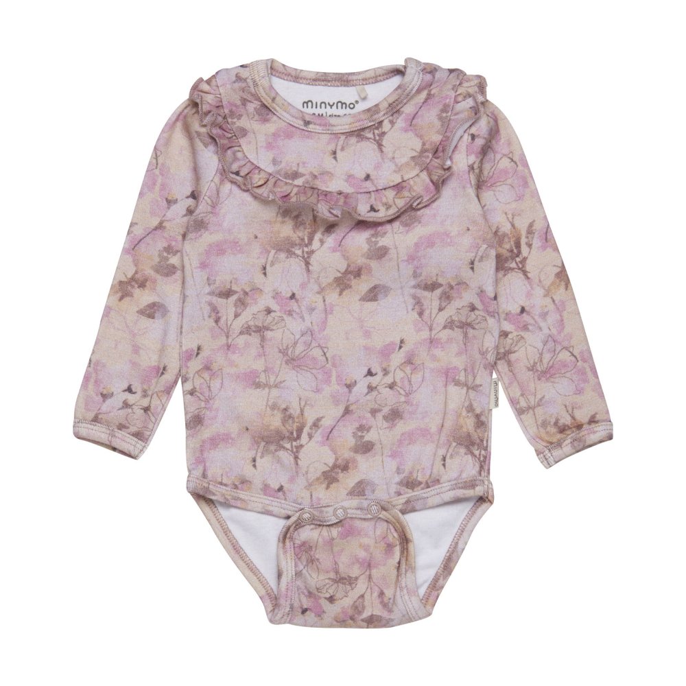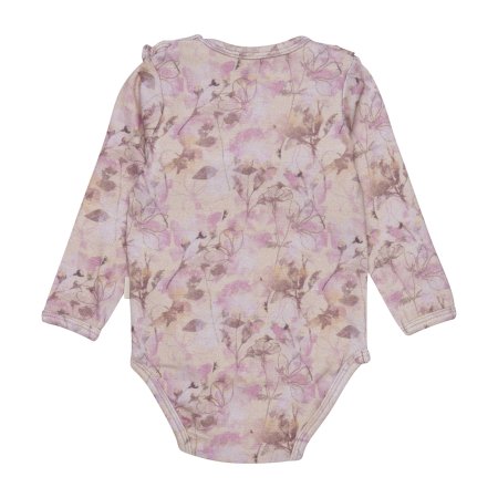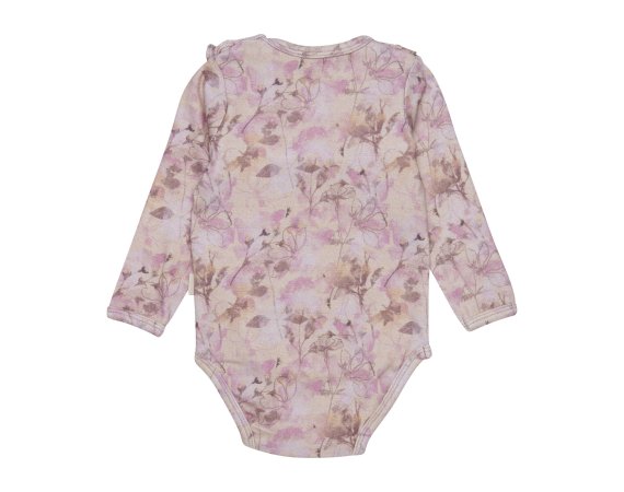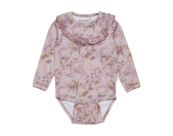 Bodyen har lange ærmer og en flot flæse i halsudskæringen foran.Bodyen lukkes med trykknapper på skulder og mellem ben.