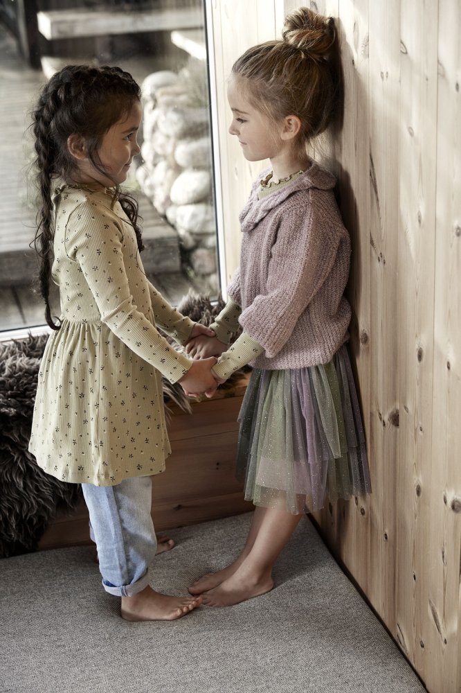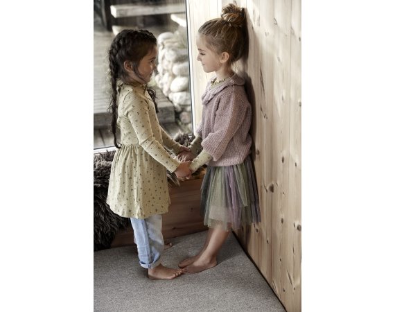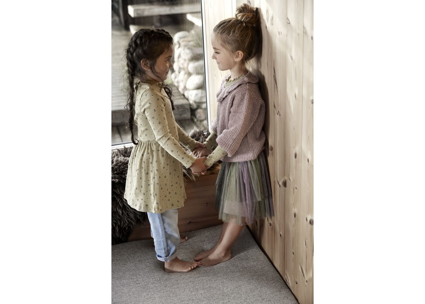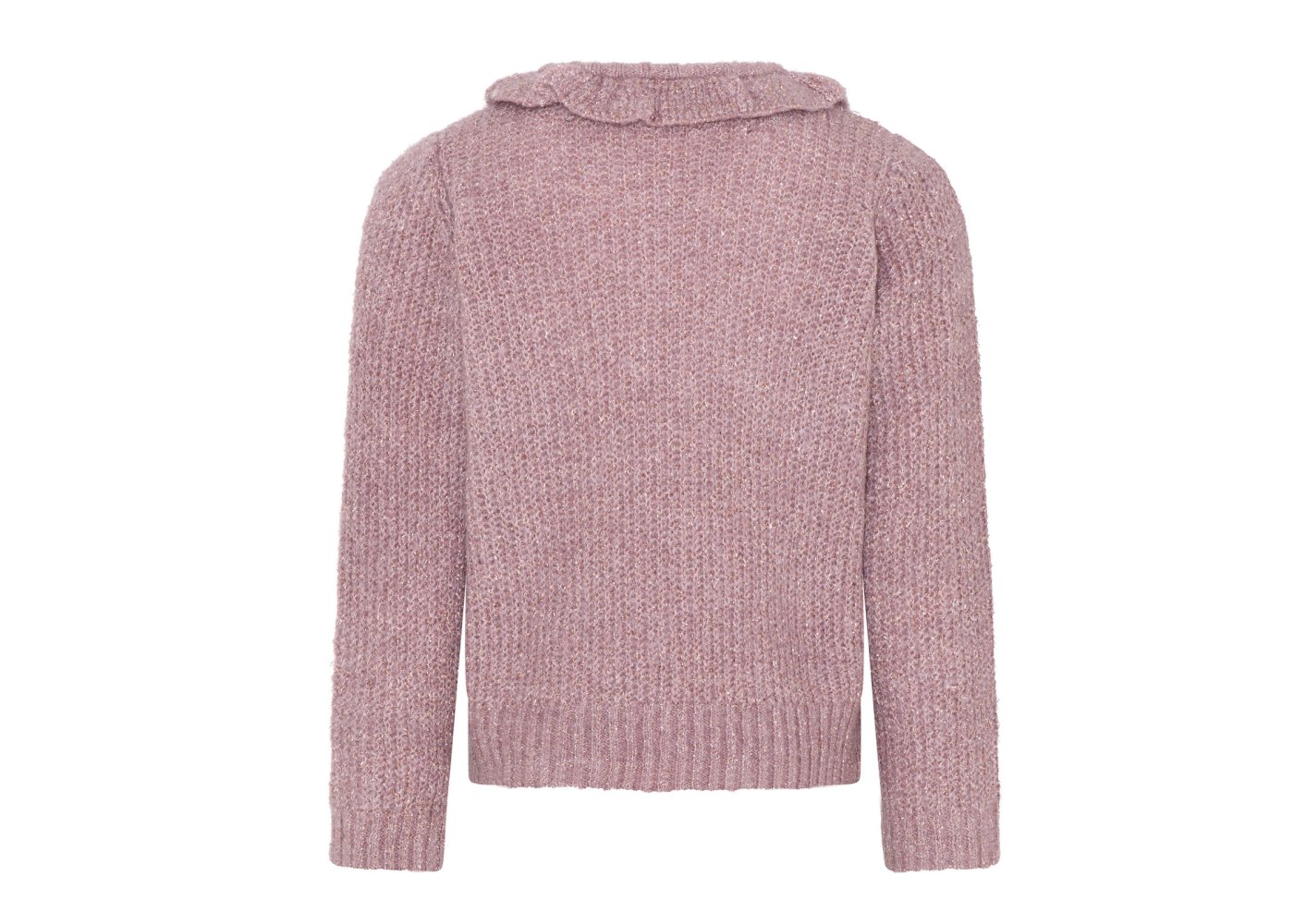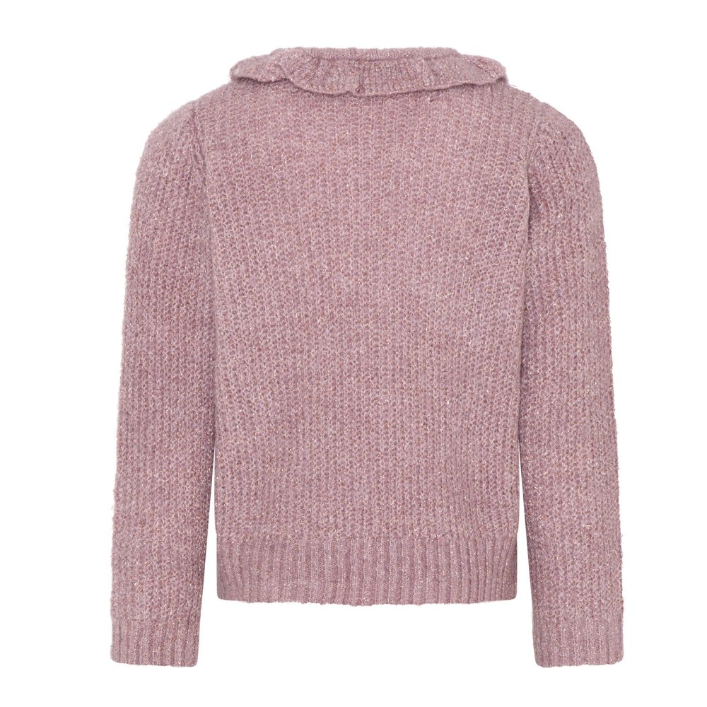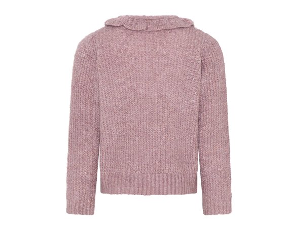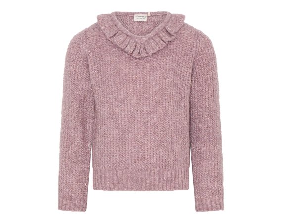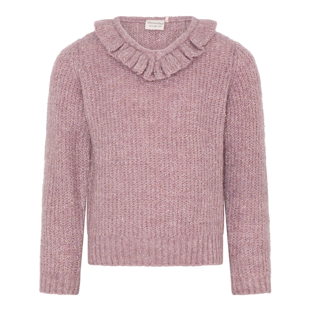 Sød rosa strik pullover med stor flæse og glimmereffekt fra Minymo.Blusen har ribkanter ved håndled og i livet.