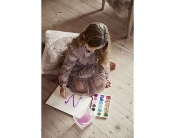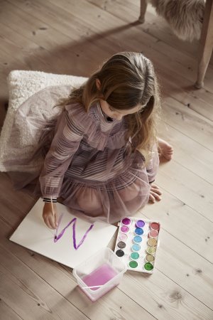 Kjolen har lange ærmer, en sød ribdetalje i halsudskæring og en fin talje med rynk.