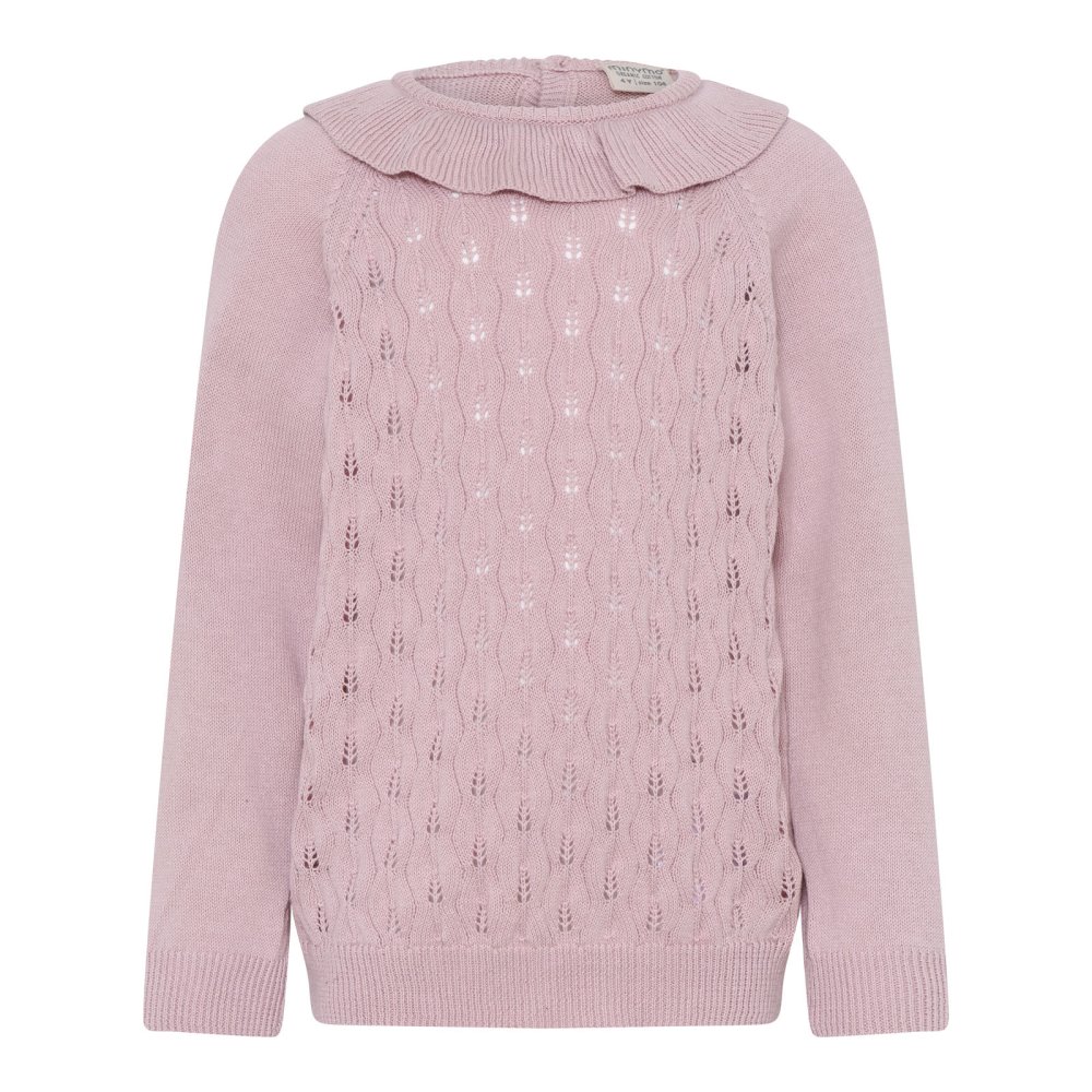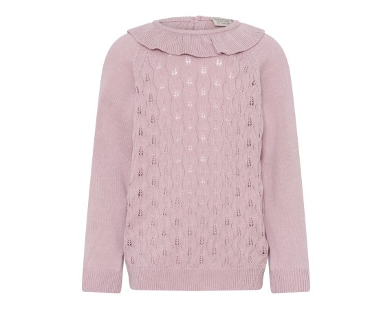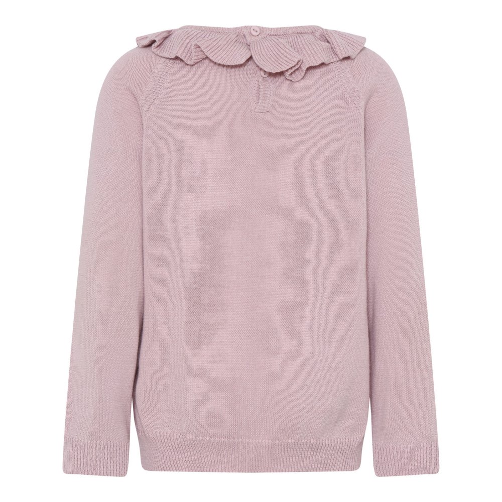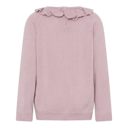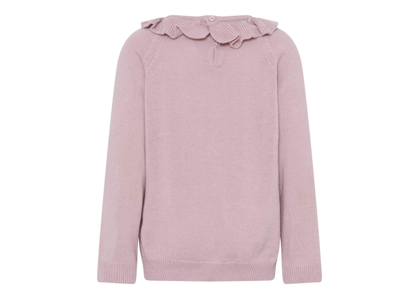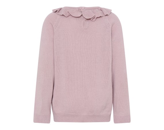 Strikblusen har en fin feminin flæse ved halsudskæring, og lukkes med knapper i ryggen.