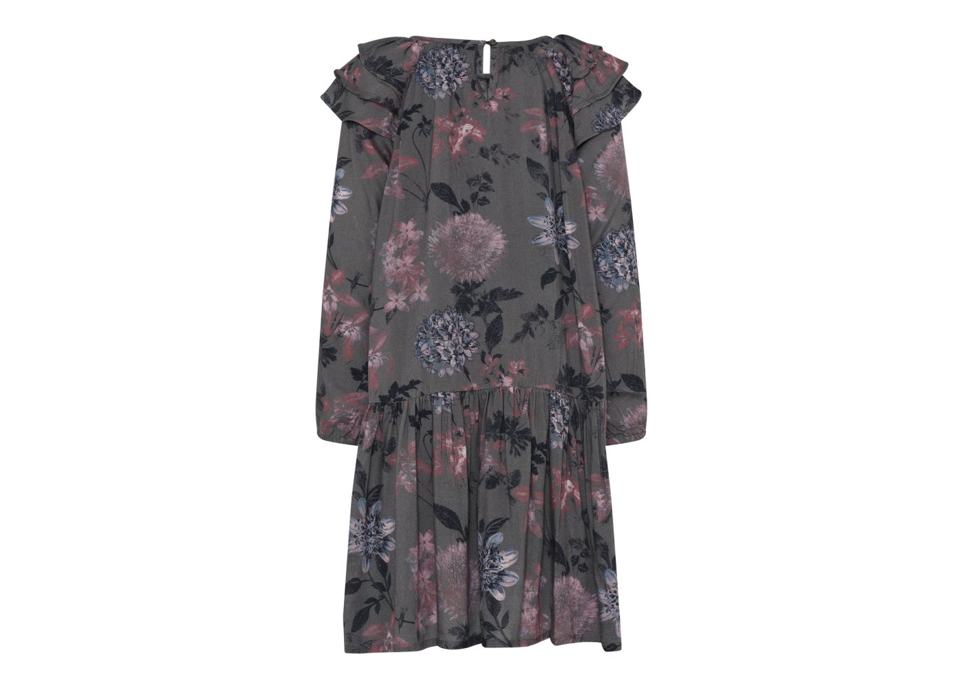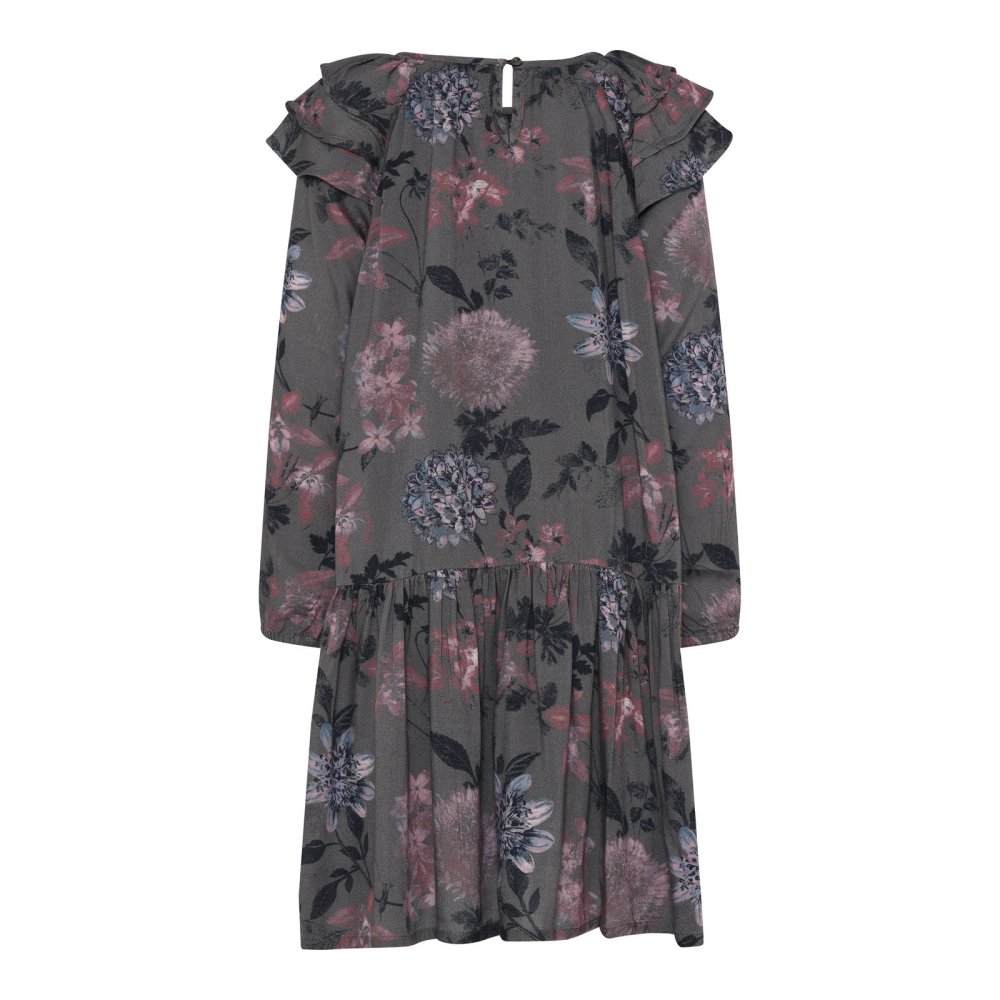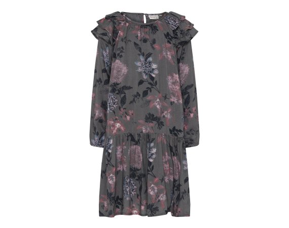 Kjolen har lange ærmer, rynk i halsudskæring og flere lag af flæser på skuldre, der giver et feminint look.