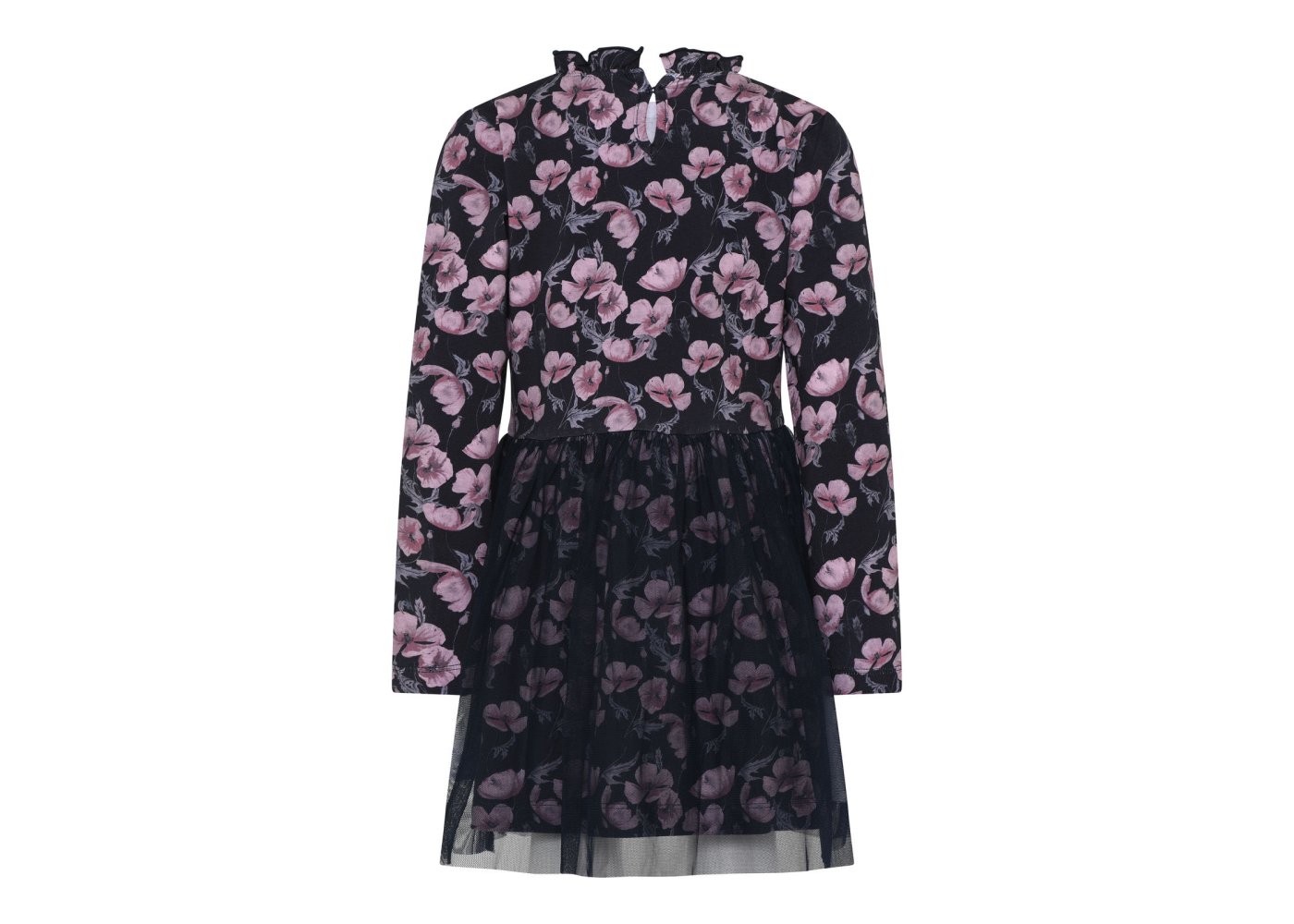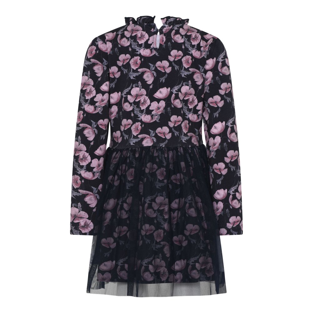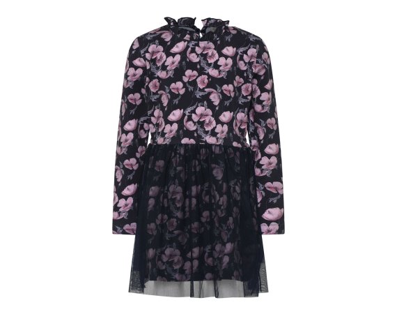 Kjolen har en høj hals med flæse samt påsyet tylskørt. Den lukkes med knap i ryggen.