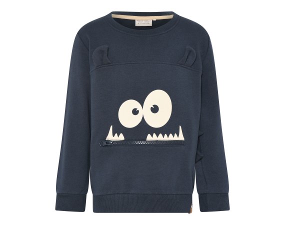 Monsteret har påsyede ører og dets mund er en lynlåslomme. Sweatshirten har ribkanter i alle åbninger, og den er fremstillet i en lækker børstet bomuld, der gør den behagelig at have på.