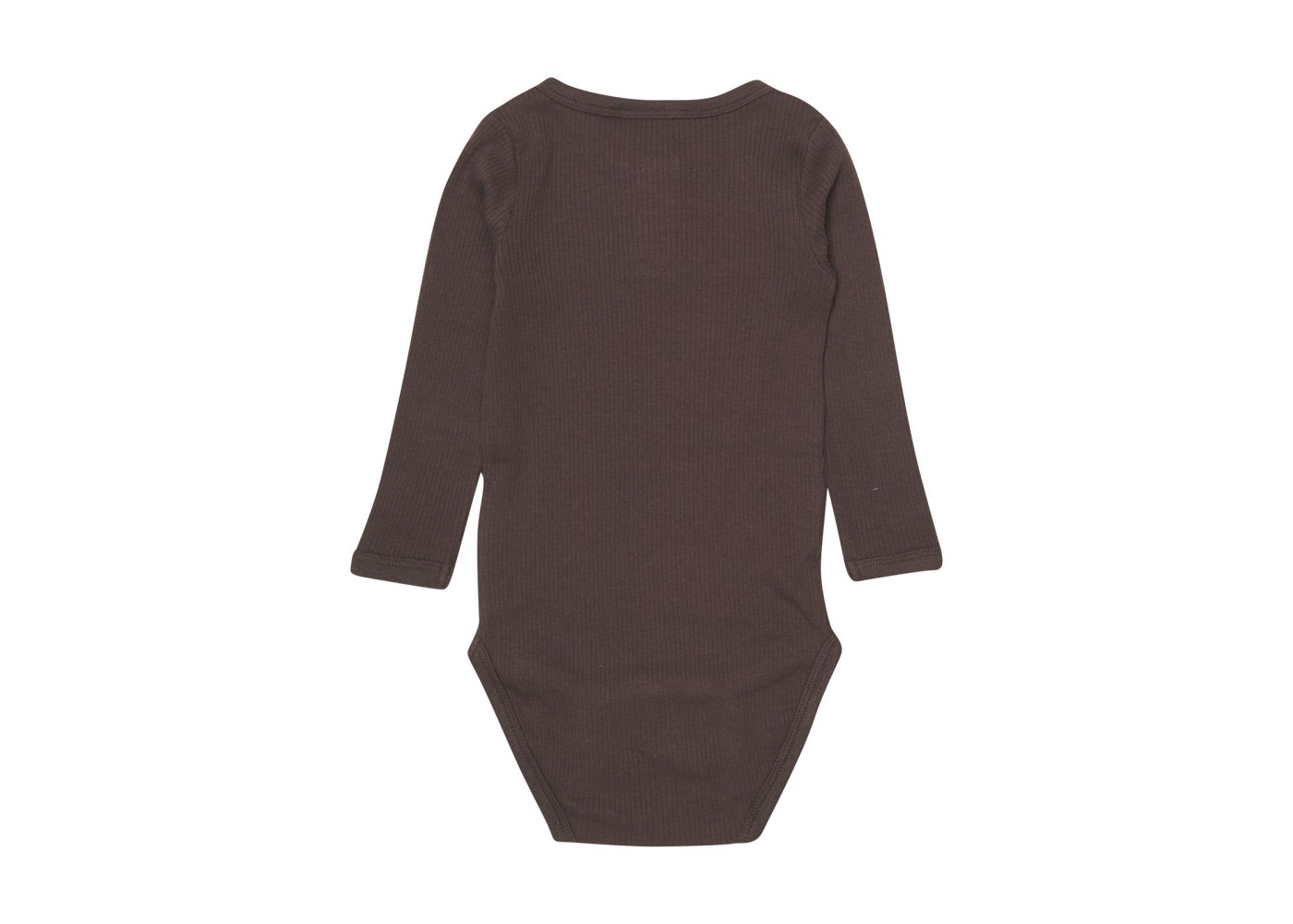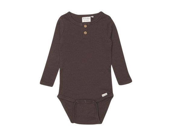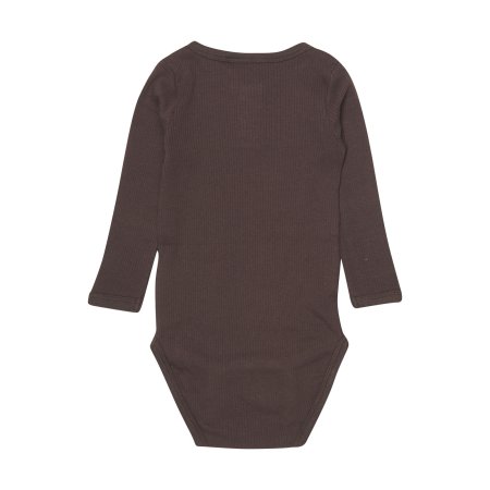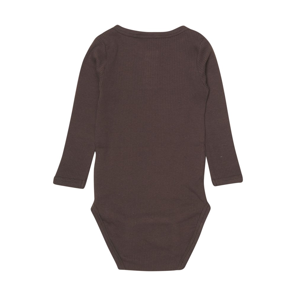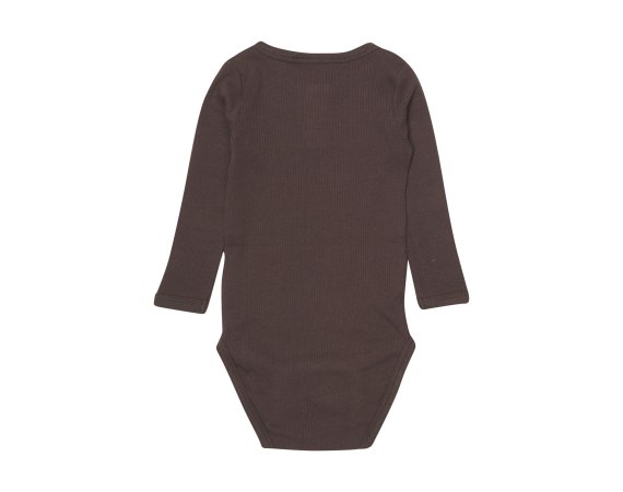 Skøn langærmet brun body med knapper og stolpelukning foran.Bodyen lukkes med trykknapper ved stolpelukning og mellem ben.Der fås bukser i samme lækre farve.